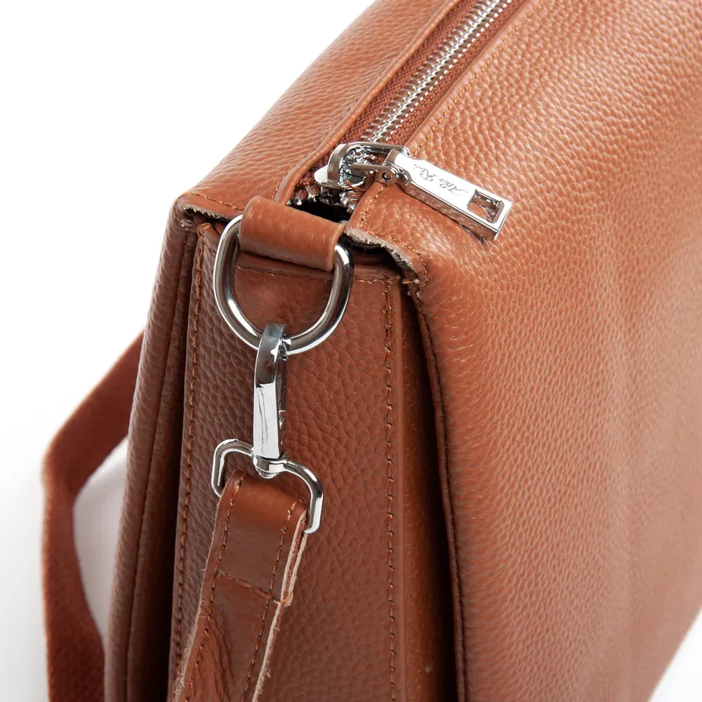 Изготовлена из натуральной мягкой кожи. Закрывается на молнию. Внутри находятся три отделения разделенные карманом-перегородкой. Среднее отделение дополнительно закрывается на молнию и внутри находится боковой открытый карман и карман на молнии. Снаружи сумки на обратной стороне расположен карман на молнии.