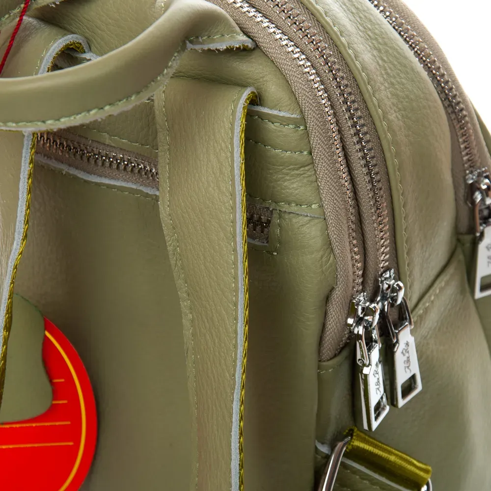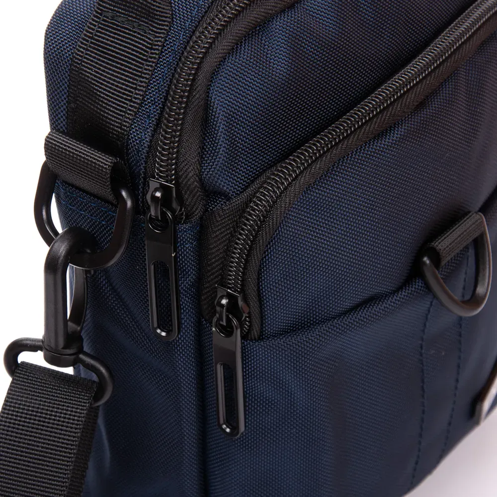 Закрывается на молнию. Внутри находится двойное отделение, разделенное карманом-перегородкой на молнии, открытый карман и боковой карман на молнии. Снаружи сумки на фасаде есть два больших кармана на молнии, а на обратной стороне один карман.