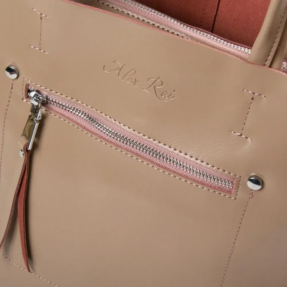 Женская сумка Alex Rai. Изготовлена из натуральной плотной кожи. Закрывается на молнию. Внутри находится двойное отделение, разделенное карманом-перегородкой на молнии, двойной открытый карман и карман на молнии на внутренних стенках сумки. На фасаде и обратной стороне расположены карманы на молнии. Дно сумки с металлическими ножками. В комплекте регулируемый плечевой ремень.