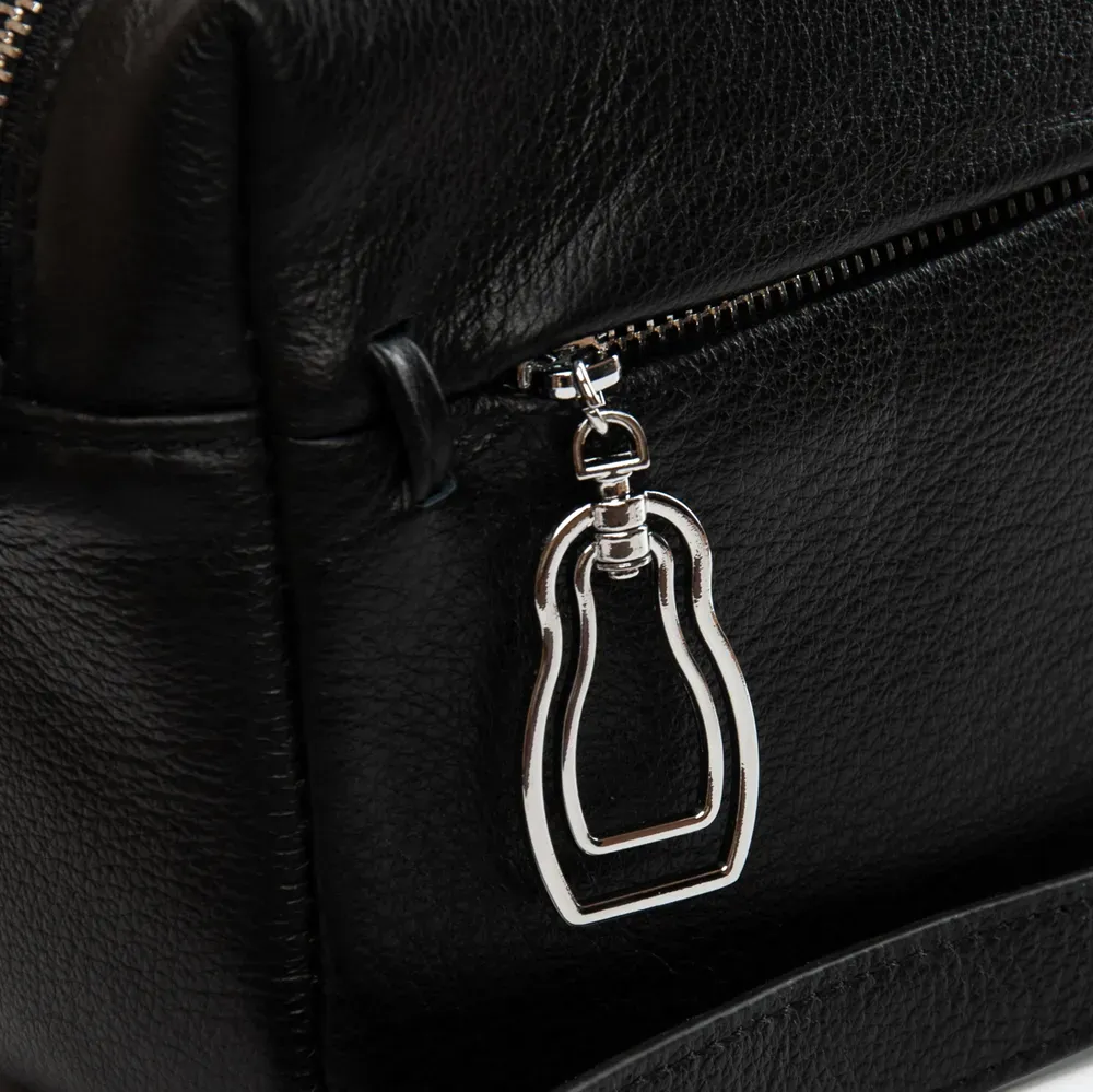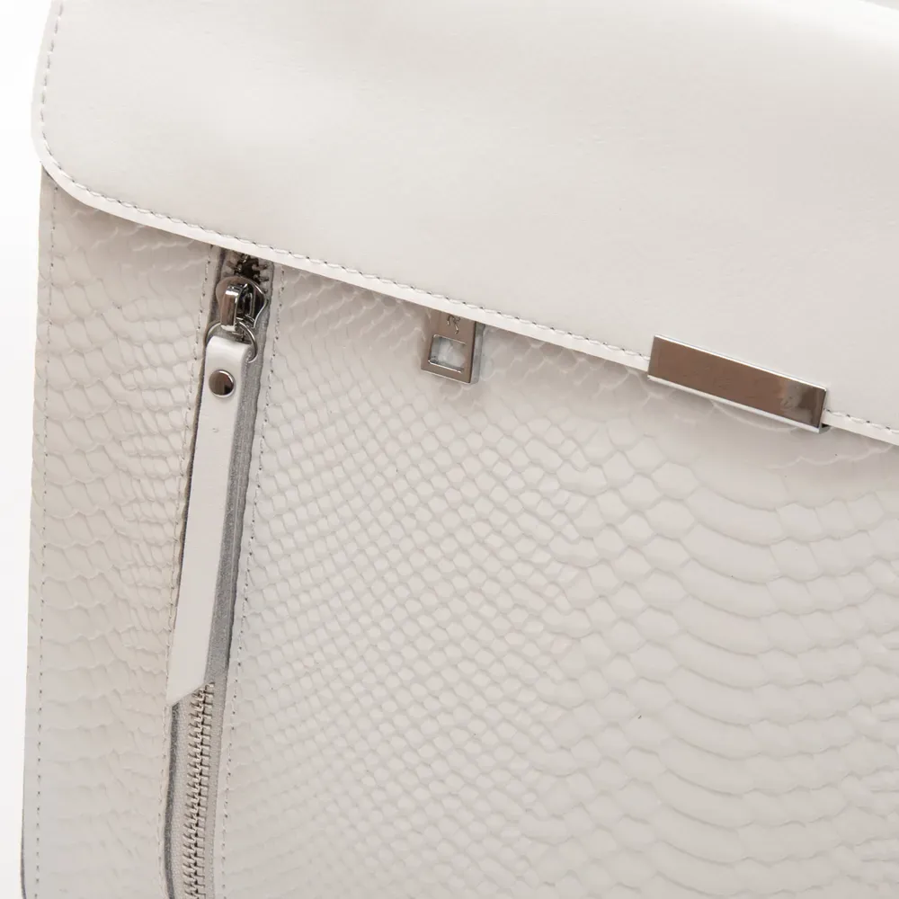 Закрывается на молнию. Внутри находится двойное отделение, разделенное карманом-перегородкой на молнии, открытый карман и боковой карман на молнии. Снаружи сумки на обратной стороне есть большой карман на молнии. Уплотненное дно на металлических ножках.
