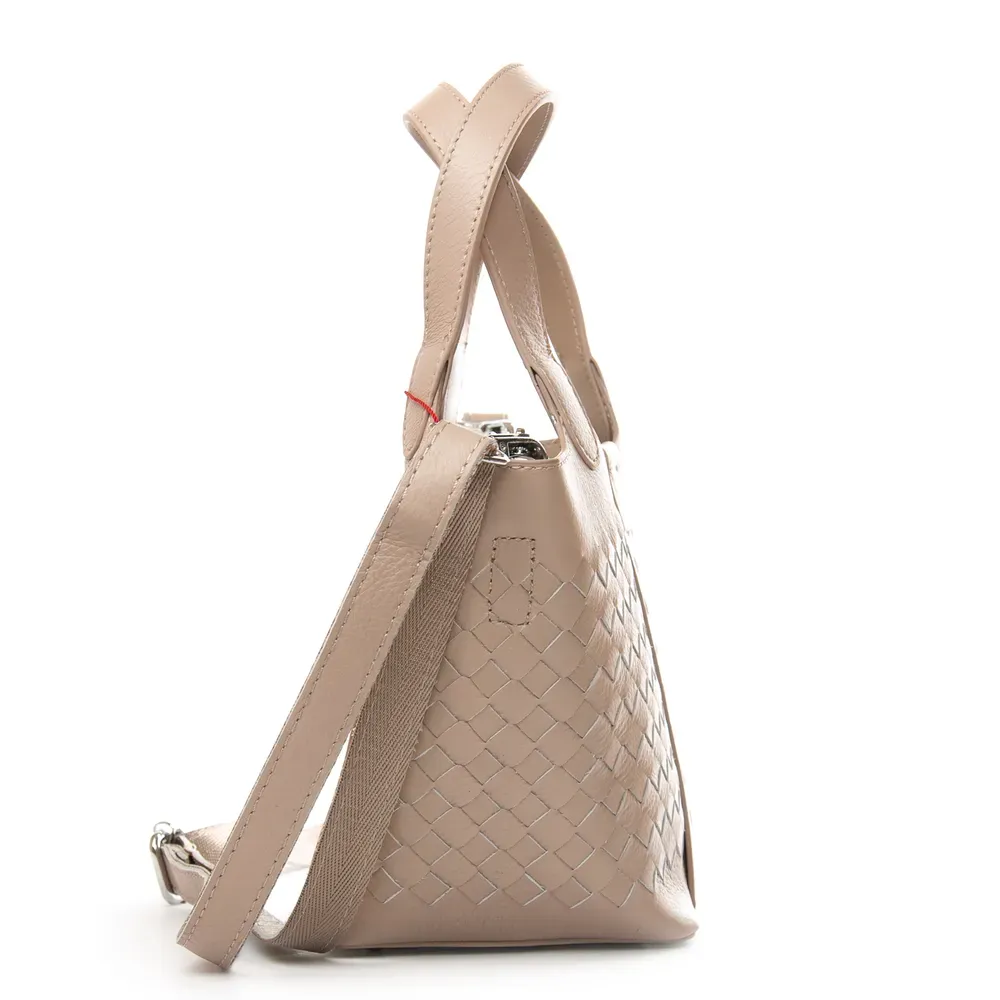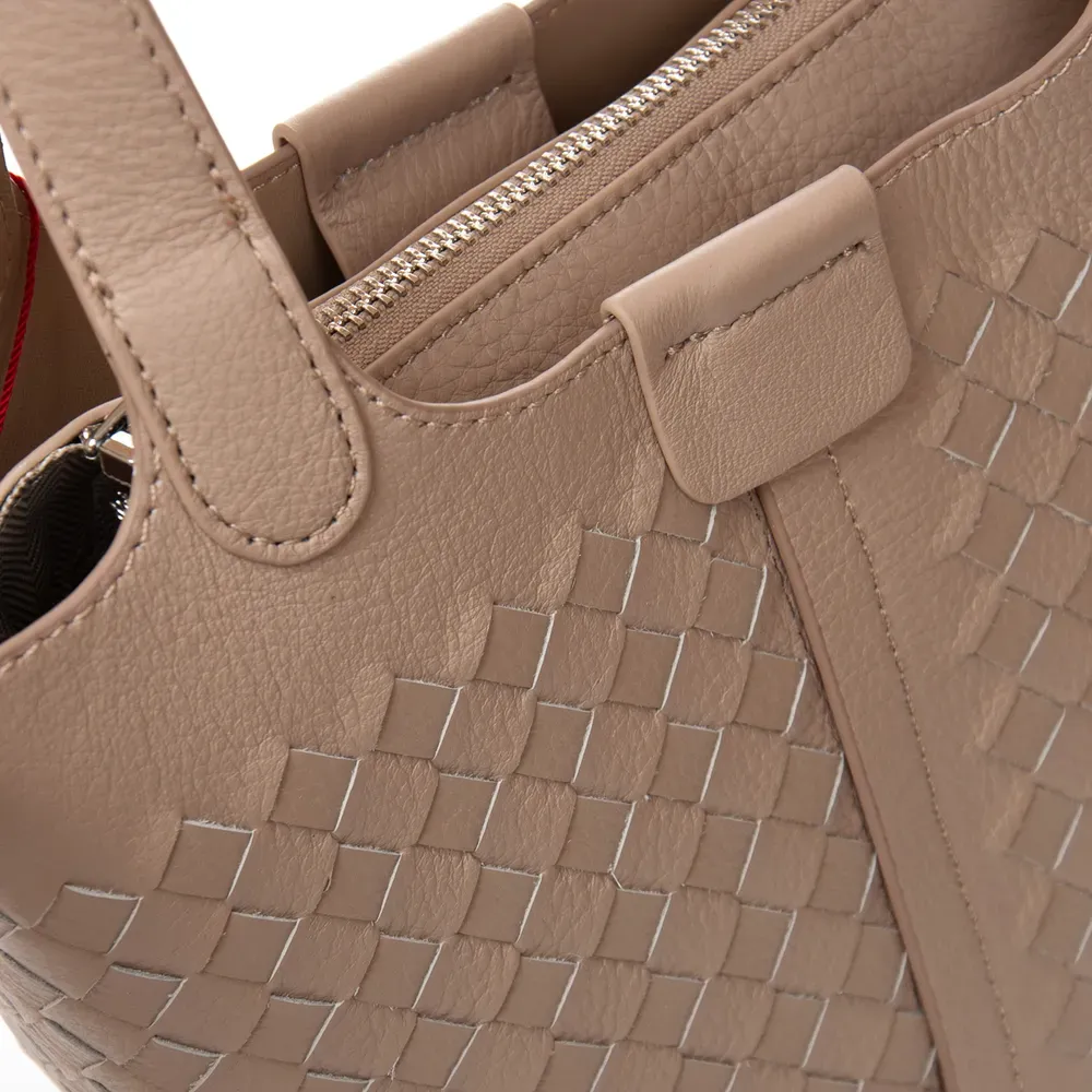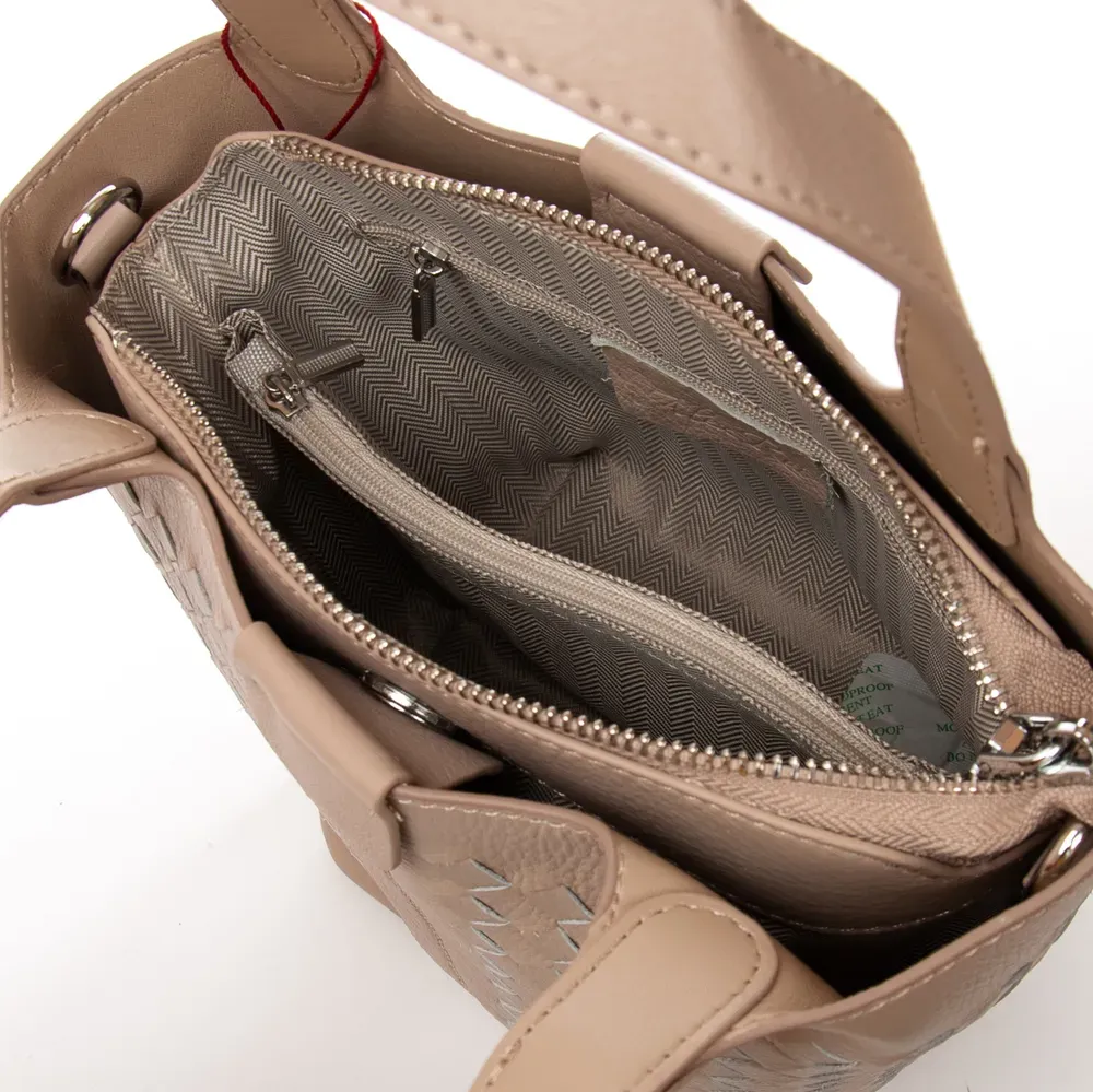 Закрывается на молнию. Внутри находится двойное отделение, разделенное карманом-перегородкой на молнии, открытый карман и карман на молнии. Снаружи сумки на обратной стороне расположен карман на молнии.