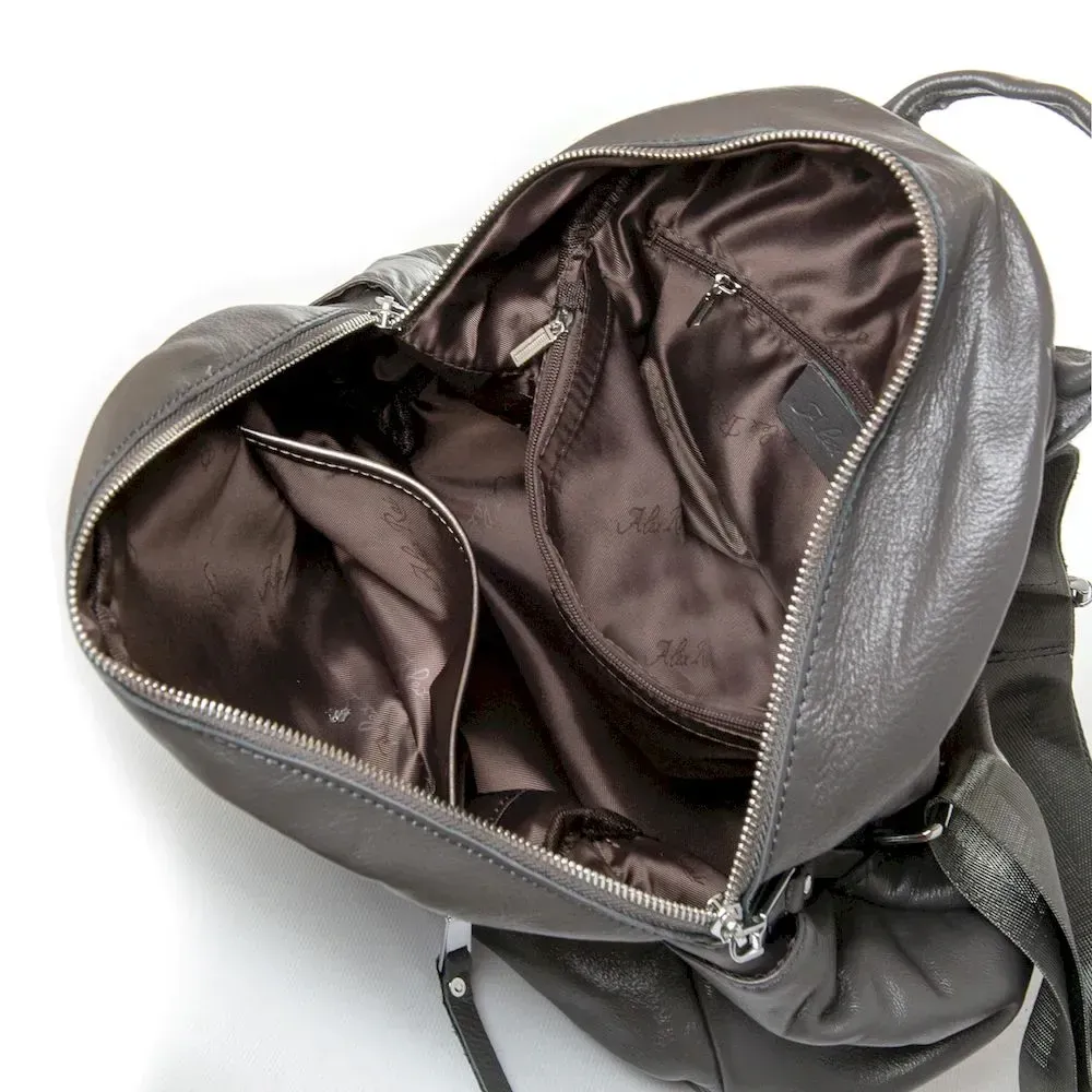 Женский рюкзак Alex Rai. Изготовлен из натуральной мягкой кожи. Закрывается на молнию. Внутри находится двойное отделение, разделенное карманом-перегородкой на молнии, открытый карман и боковой карман на молнии. На фасаде есть два кармана на молнии, а на обратной стороне один карман. На торцах есть небольшие открытые карманы. Плечевые лямки регулируются по длине