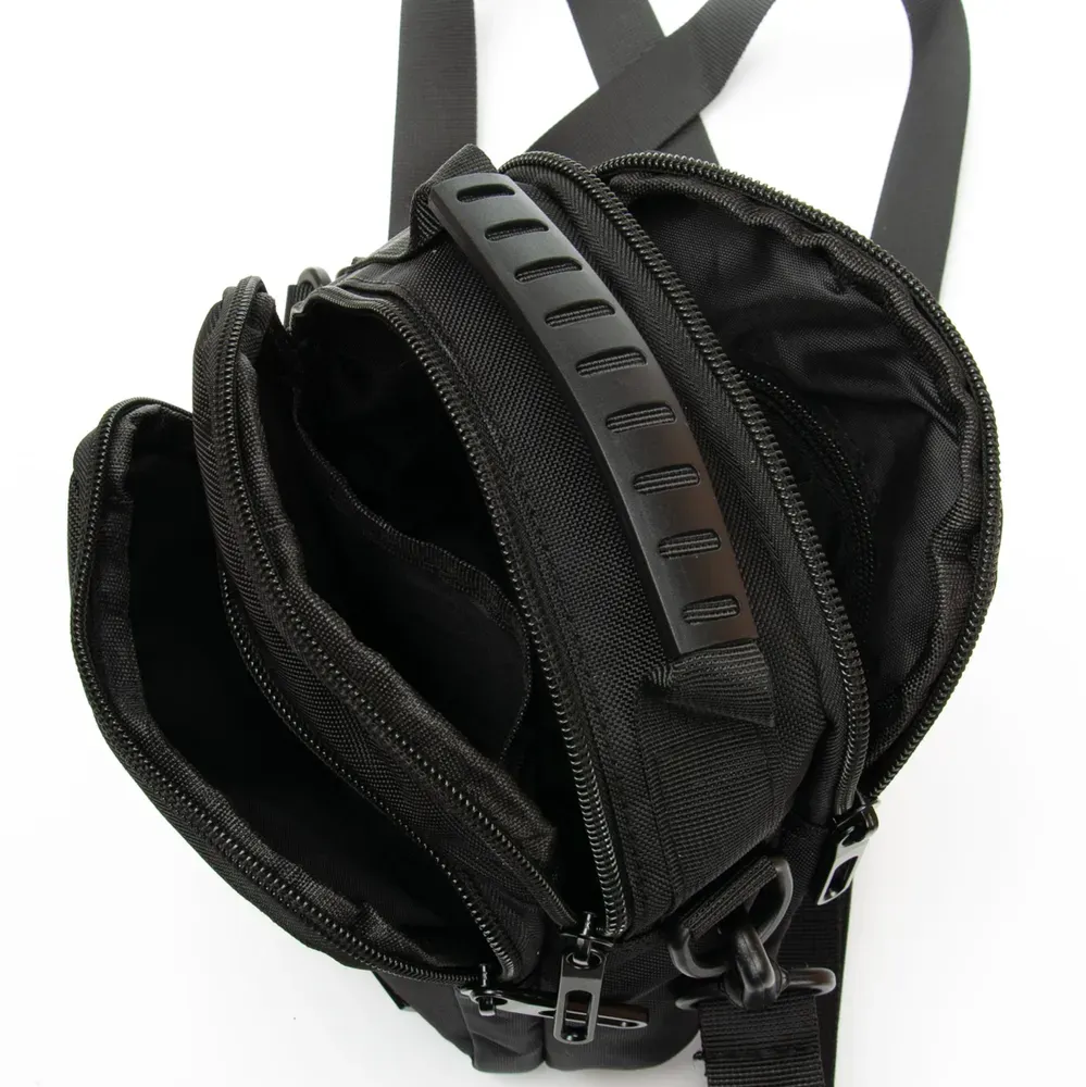 Закрывается на молнию. Внутри находится три отделения (среднее дополнительно закрывается на молнию), открытый карман и боковой карман на молнии. Снаружи сумки на фасаде есть карман под клапаном, а на обратной стороне карман на молнии.