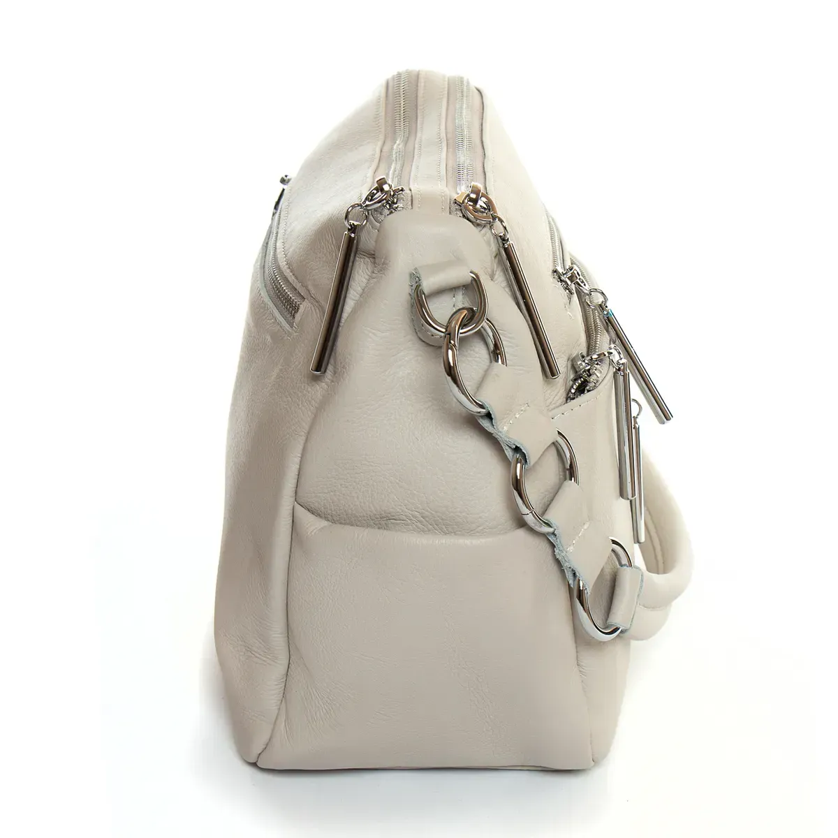 Женская кожаная сумка Alex Rai. Изготовлена из натуральной мягкой кожи. Два отделения, закрываются на молнии. Внутри отделений находятся боковой открытый карман и карман на молнии. Снаружи сумки, на фасаде расположены четыре кармана на молнии и на фасаде один карман. На торцах сумки есть небольшие открытые карманы. Уплотненное дно.