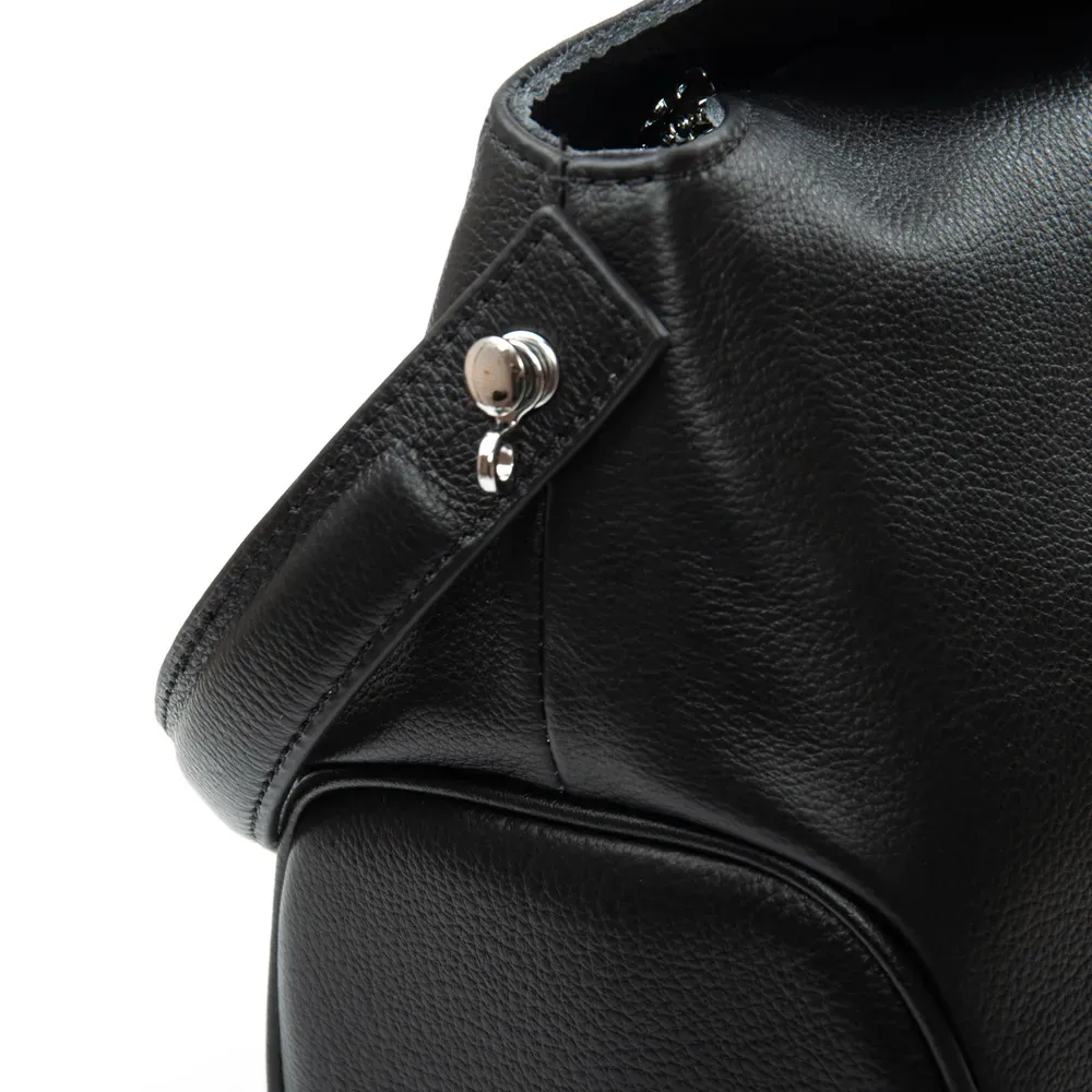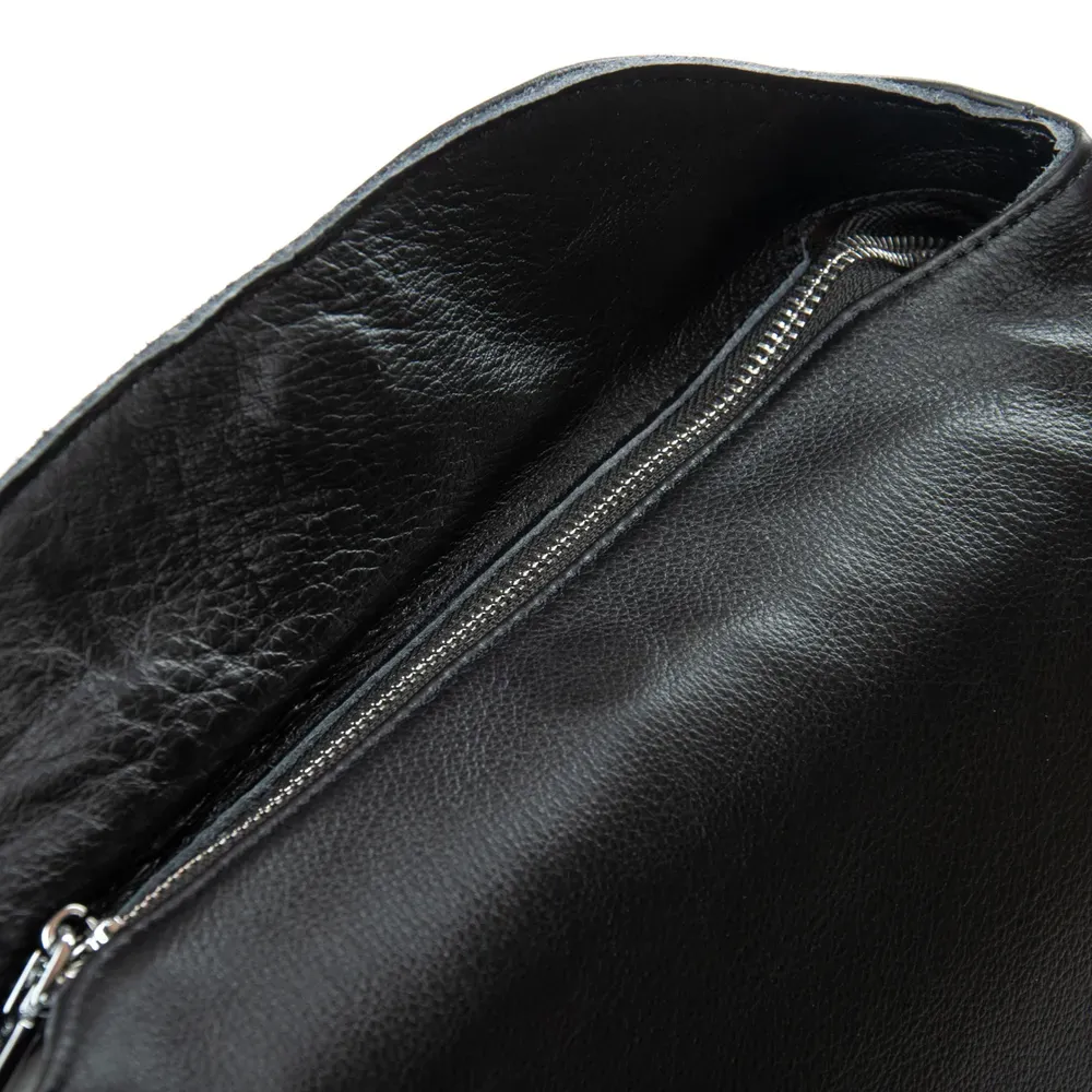 Закрывается клапаном с магнитной фиксацией и дополнительно на молнию. Внутри находится одно отделение, в котором есть боковой карман на молнии и открытый карман. Снаружи сумки на обратной стороне расположен большой карман на молнии. Уплотненное дно.