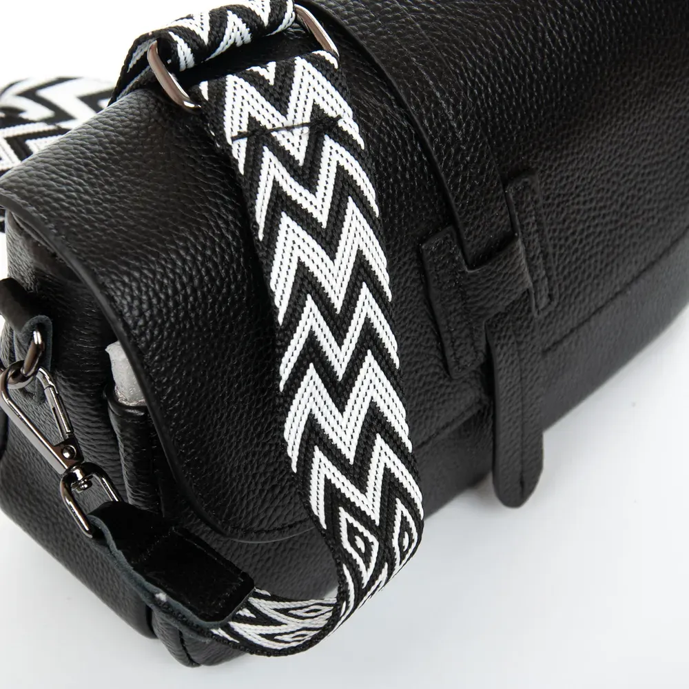 В комплекте регулируемый кожаный плечевой ремень и широкий текстильный ремень-лента.