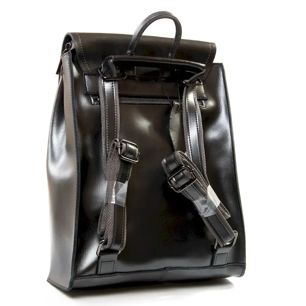 Женский кожаный рюкзак. Изготовлен из натуральной плотной кожи. Можно носить на плече на регулируемом ремне. Под клапаном дополнительно закрывается на молнию. Внутри находится основное и дополнительное отделение, разделенное карманом-перегородкой на молнии, открытый карман и карман на молнии. Снаружи рюкзака на обратной стороне расположен карман на молнии. Плечевые лямки регулируются по длине.