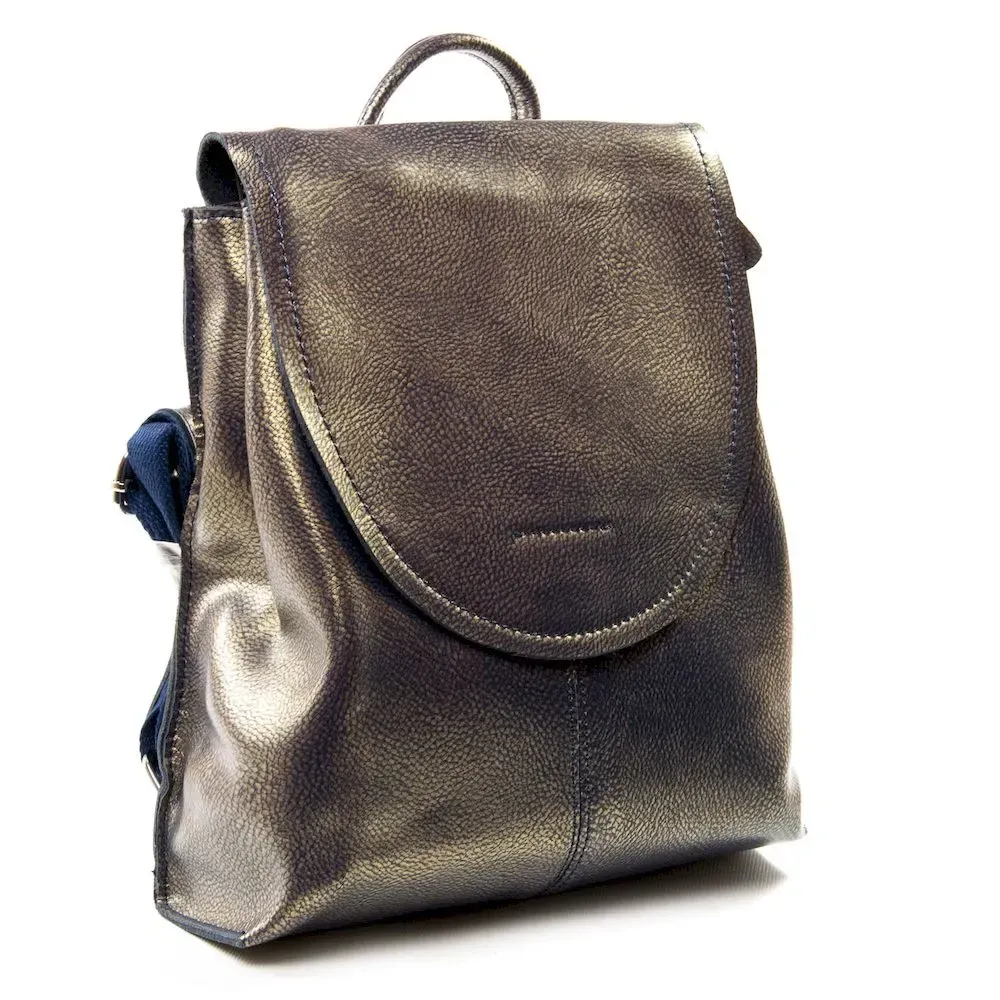 Женский кожаный рюкзак. Изготовлен из натуральной плотной кожи. Можно носить на плече на регулируемом ремне. Под клапаном дополнительно закрывается на молнию. Внутри находится основное и дополнительное отделение, разделенное карманом-перегородкой на молнии, открытый карман и карман на молнии. Снаружи рюкзака на обратной стороне расположен карман на молнии. Плечевые лямки регулируются по длине.