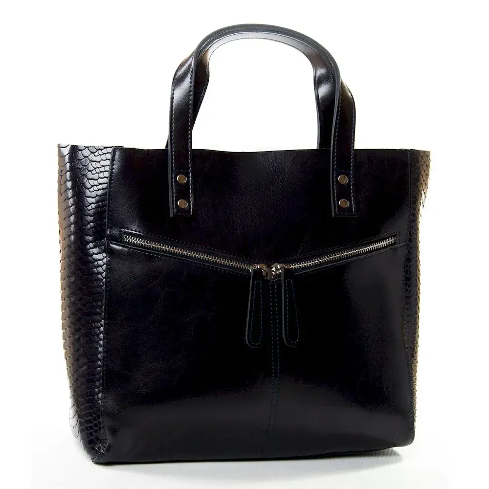 Женская сумка из натуральной кожи. Закрывается на молнию. Внутри сумки двойное отделение, разделенное карманом-перегородкой на молнии, боковой карман на молнии и открытый двойной карман. На обратной стороне сумки карман на молнии. На фасаде два кармашка на молнии. В комплекте регулируемый плечевой ремень.