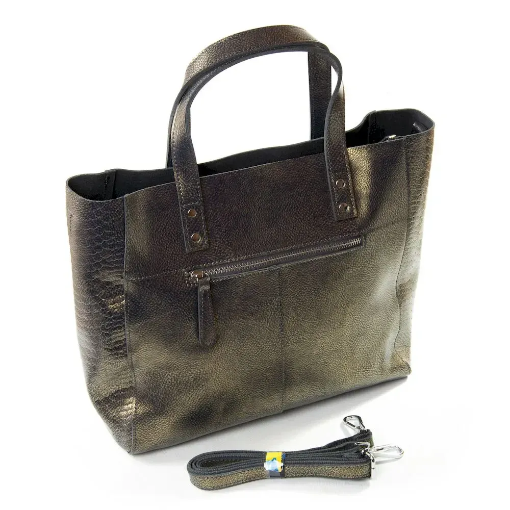 Женская сумка из натуральной кожи. Закрывается на молнию. Внутри сумки двойное отделение, разделенное карманом-перегородкой на молнии, боковой карман на молнии и открытый двойной карман. На обратной стороне сумки карман на молнии. На фасаде два кармашка на молнии. В комплекте регулируемый плечевой ремень.