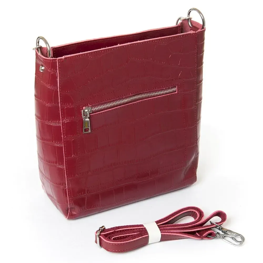 Женская кожаная сумка. Изготовлена из натуральной плотной кожи. Одно отделение, закрывается на молнию. Внутри есть открытый боковой карман и карман на молнии. На обратной стороне находится карман на молнии. В комплекте регулируемый плечевой ремень.