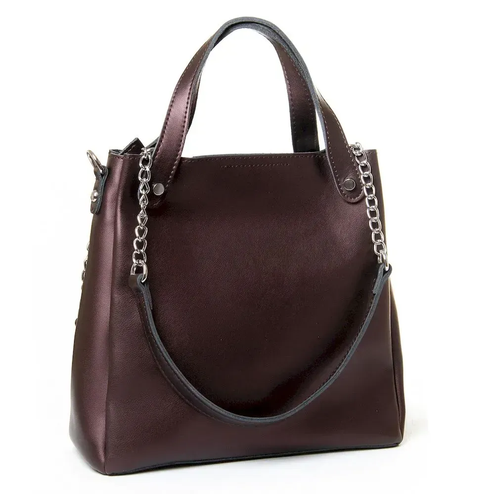 Женская кожаная сумочка. Изготовлена из натуральной плотной кожи. Три отделения. Центральное закрывается на молнию, а боковые на магнитную кнопку. Внутри центральное отделение разделенно карманом-перегородкой на молнии, также есть открытый карман и карман на молнии. В комплекте регулируемый плечевой ремень.