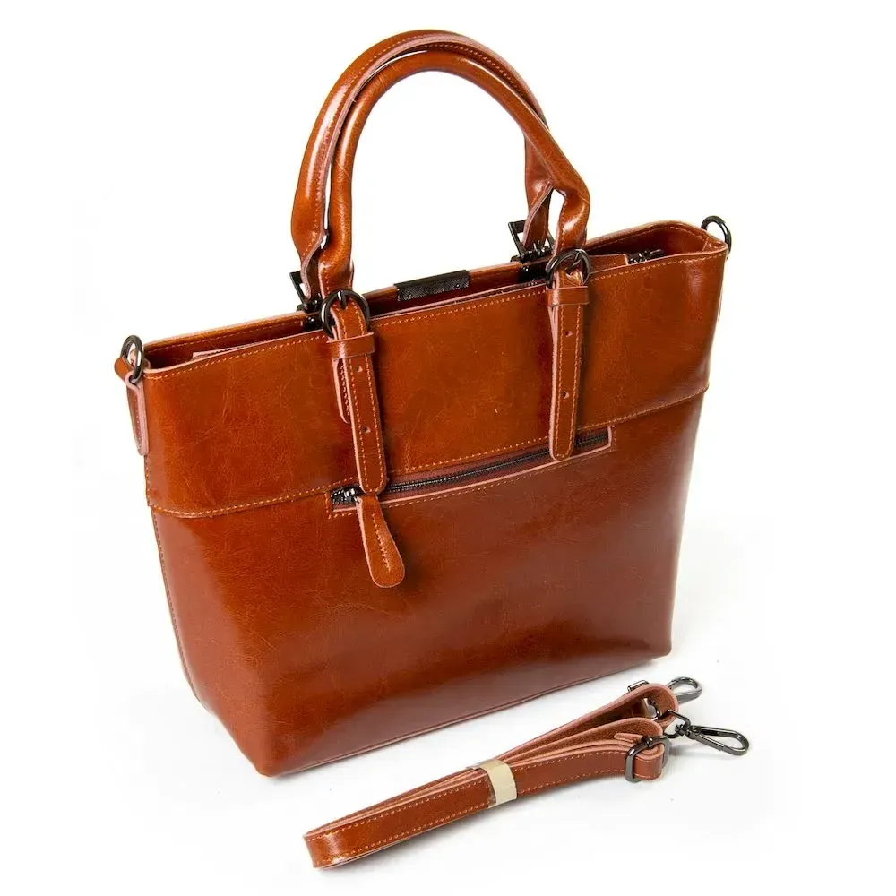 Женская сумка Luxeva. Изготовлена из натуральной плотной кожи. Закрывается на молнию. Внутри находится двойное отделение, разделенное карманом-перегородкой на молнии, двойной открытый карман и карман на молнии. Снаружи сумки, на лицевой стороне расположены два кармана закрывающиеся на магнит и молнию, на обратной стороне расположен карман на молнии. Дно плотное. В комплекте регулируемый плечевой ремень.