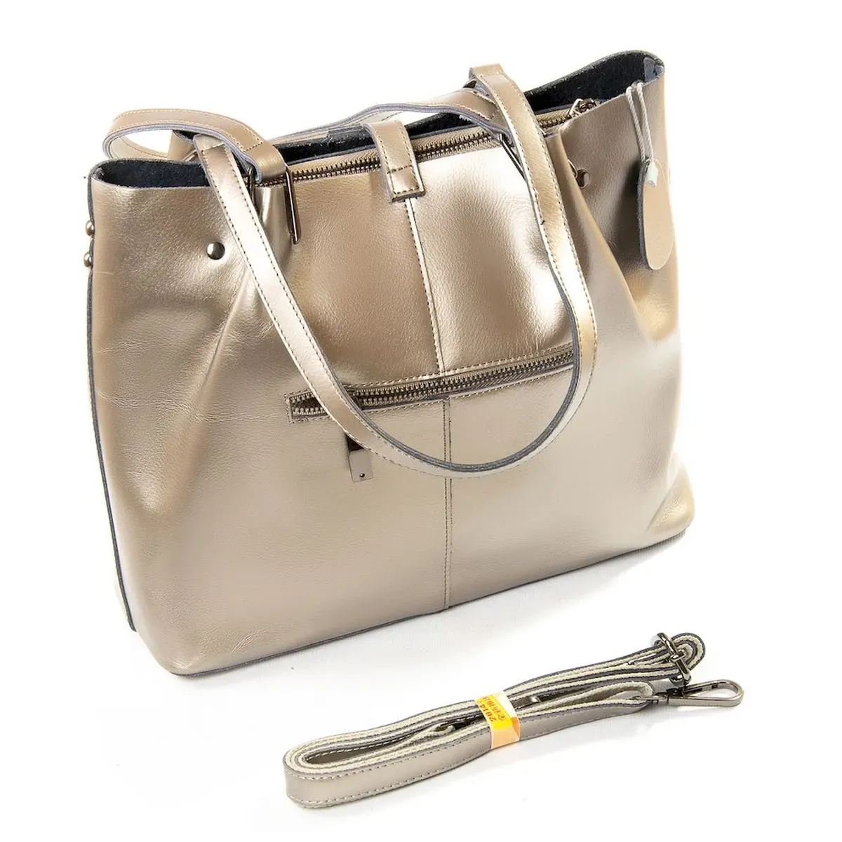 Женская сумка Luxeva. Изготовлена из натуральной плотной кожи. Закрывается на молнию. Внутри находится двойное отделение, разделенное карманом-перегородкой на молнии, двойной открытый карман и карман на молнии. Снаружи сумки, на обратной стороне расположен карман на молнии. Дно плотное с металическими ножками. В комплекте регулируемый плечевой ремень.