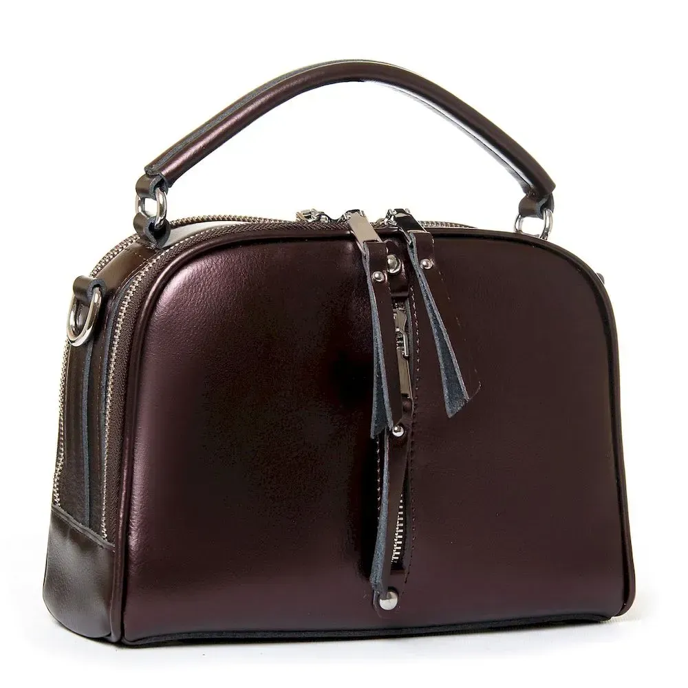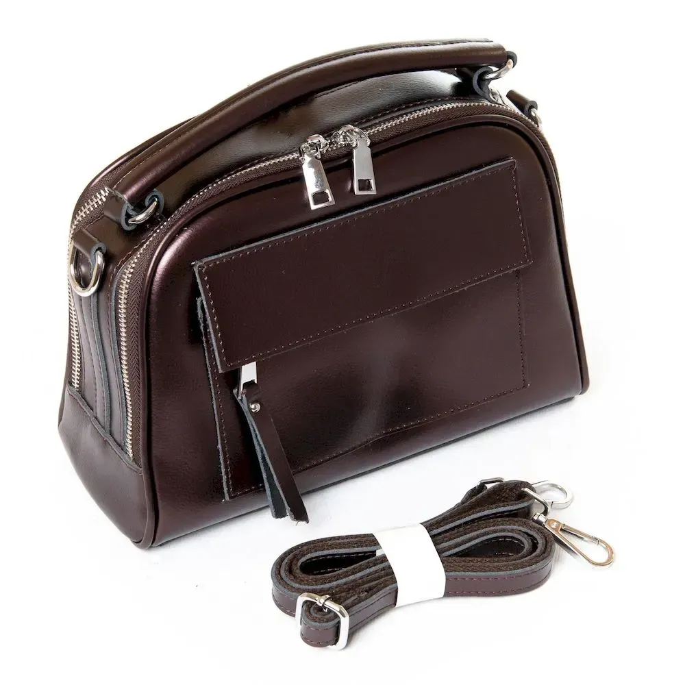 Женская кожаная сумочка. Изготовлена из плотной натуральной кожи. Одно отделенин, закрывается на молнию. Внутри находится двойное отделение, разделенное карманом-перегородкой на молнии, открытый карман и карман на молнии. На фасаде и обратной стороне находятся карманы на молнии. В комплекте регулируемый плечевой ремень.