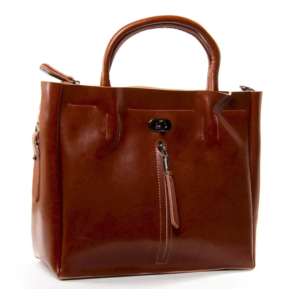 Женская сумка. Изготовлена из натуральной кожи. Закрывается на молнию. Внутри находится двойное отделение, разделенное карманом-перегородкой на молнии, двойной открытый карман и карман на молнии на внутренних стенках сумки. На обратной и лицевой стороне есть карманы на молнии. Сумка имеет жесткое дно. В комплекте регулируемый плечевой ремень.