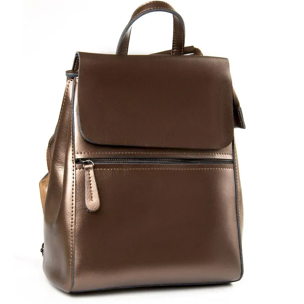 Женский кожаный рюкзак. Изготовлен из натуральной плотной кожи.. Можно носить на плече на регулируемом ремне. Под клапаном дополнительно закрывается на молнию. Внутри находится основное и дополнительное отделение, разделенное карманом-перегородкой на молнии, двойной открытый карман и карман на молнии. Снаружи рюкзака на лицевой и тыльной стороне расположены карманы на молнии. Плечевые лямки регулируются по длине.