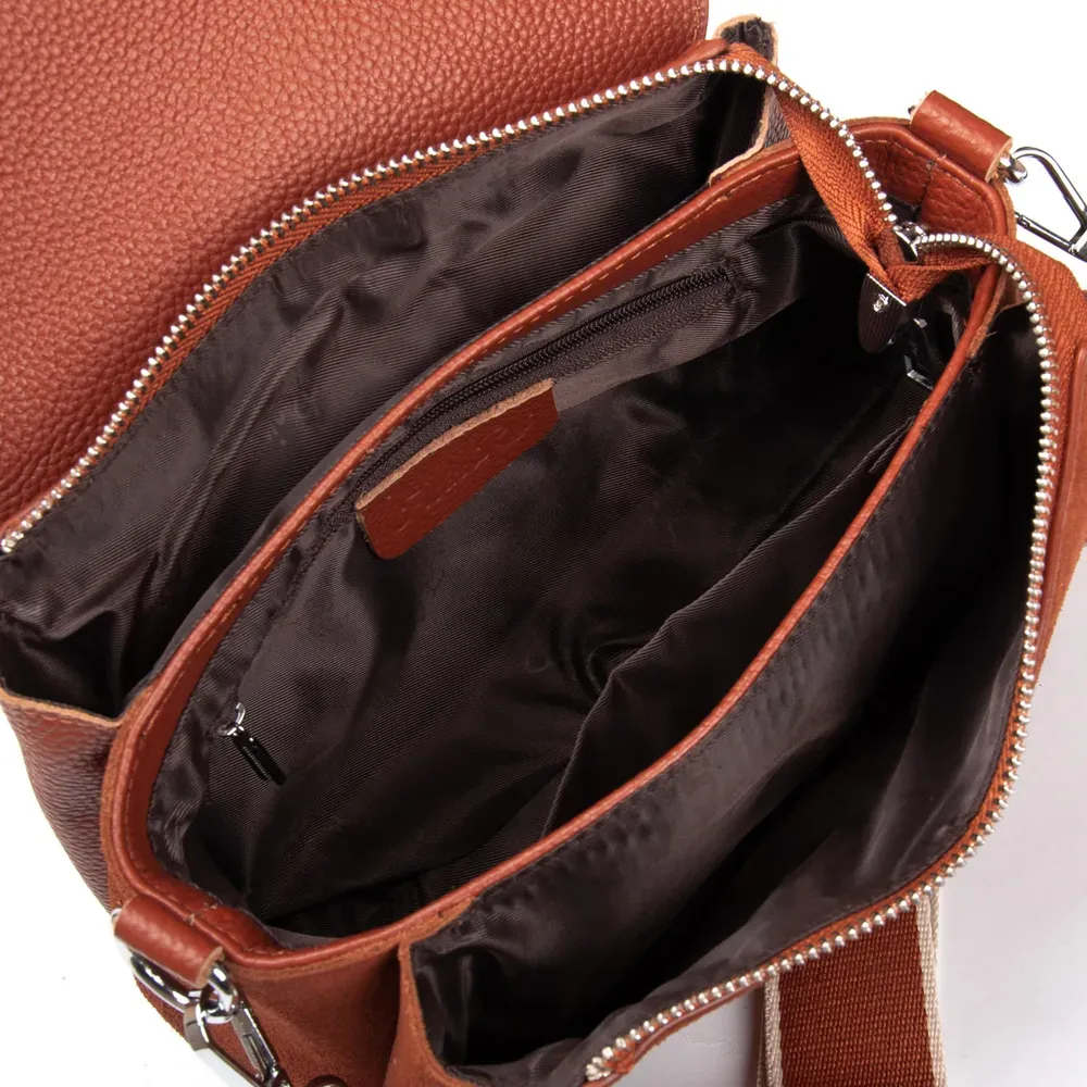 Под клапаном находятся три отделения, которые дополнительно закрываются на общую молнию. Внутри центрального отделения есть боковой карман на молнии и открытый карман. Снаружи сумки на обратной стороне находится карман на молнии. Клапан закрывается на магнитную кнопку.
