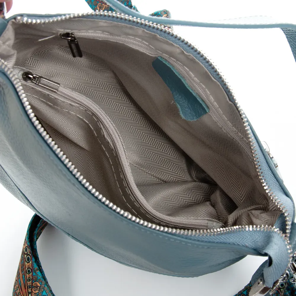 Изготовлена из водоотталкивающего плотного текстиля. Одно основное отделение, закрывается на молнию. Внутри находится боковой карман на молнии и открытый двойной карман. На фасаде и обратной стороне сумки находятся большие карманы на молнии.