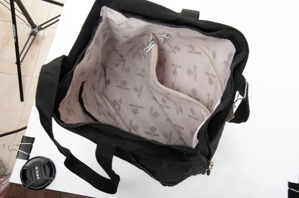 Женская сумка-шоппер Jielshi. Изготовлена из водоотталкивающего текстиля. Закрывается на молнию. Внутри находится основное и дополнительное отделения, разделенные карманом-перегородкой на молнии, большой боковой карман на молнии и открытый карман. На обратной стороне сумки находится вместительный карман на молнии.