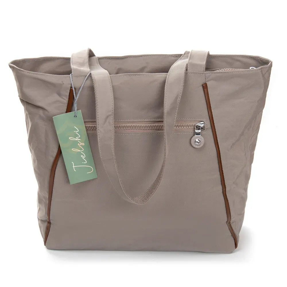 Женская сумка-шоппер Jielshi. Изготовлена из водоотталкивающего текстиля. Закрывается на молнию. Внутри находится основное и дополнительное отделения, разделенные карманом-перегородкой на молнии, большой боковой карман на молнии и открытый карман. На обратной стороне сумки находится вместительный карман на молнии.