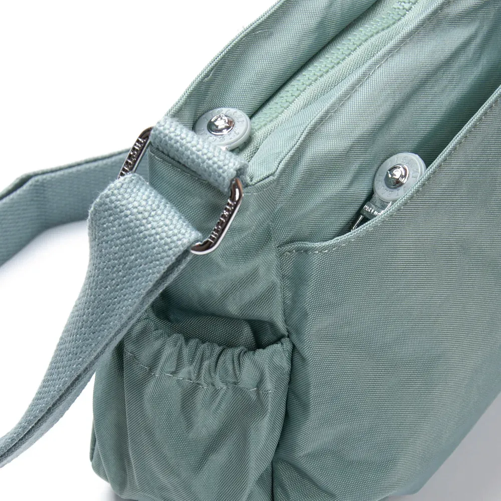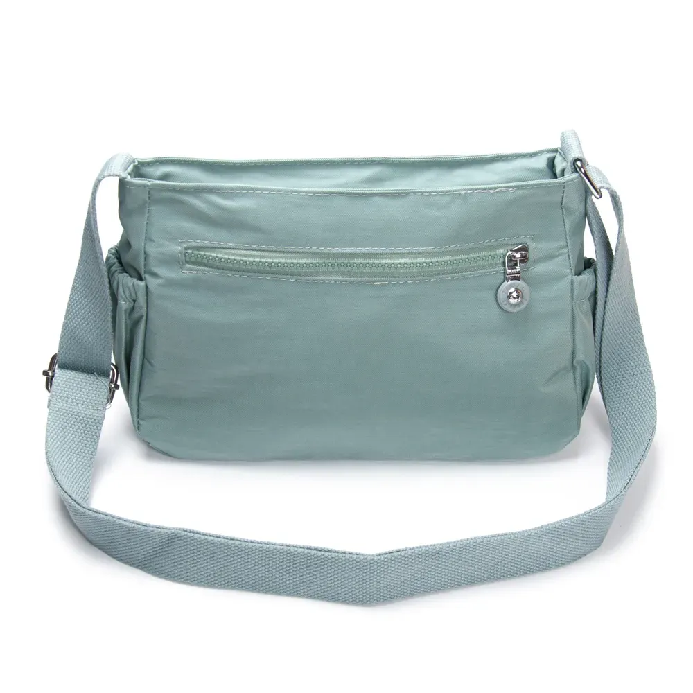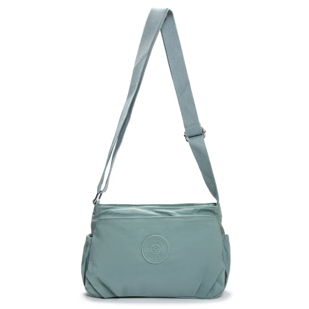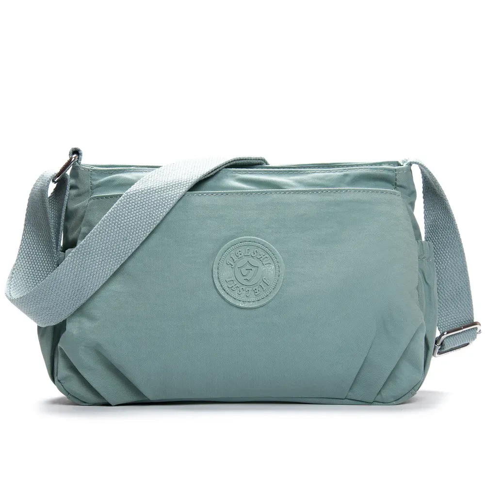 Женская сумка кросс-боди Jielshi. Изготовлена из водоотталкивающего текстиля. Одно отделение, закрывается на молнию. Внутри есть большой открытый боковой карман и карман на молнии. На фасаде и на обратной стороне находятся вместительные карманы на молнии. На торцах сумочки есть небольшие открытые карманы на резинке.