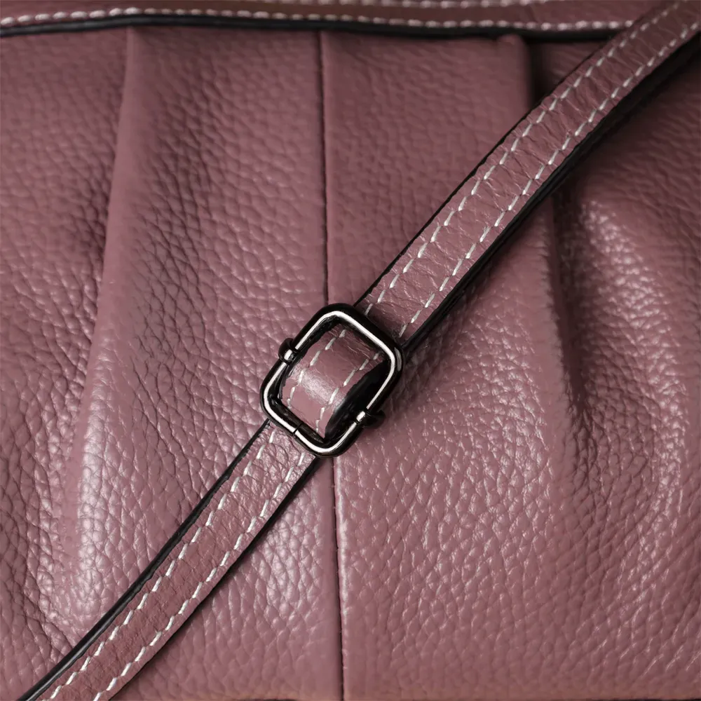 Пурпурна шкіряна сумка з драпіруванням - це аксесуар з характером: вишуканий, помітний і водночас практичний. Ідеально підійде як для буднів, так і для особливих випадків, коли хочеться виглядати особливо ефектно.