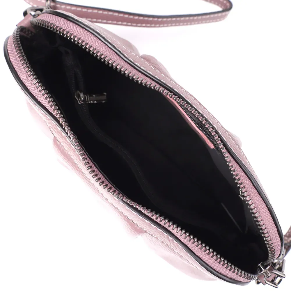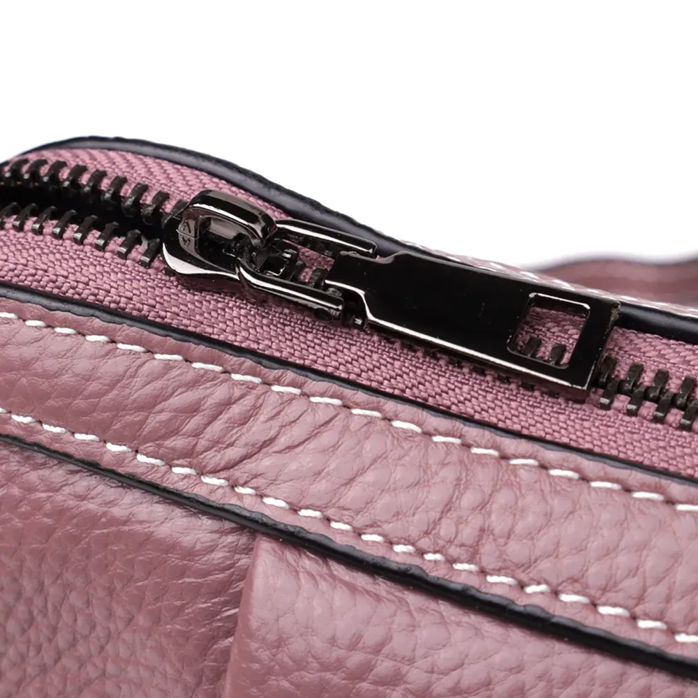 По краях сумка декорована контрастним білим рядком, який підкреслює форму і додає витонченості. Фурнітура у кольорі темного срібла гармонійно доповнює насичений пурпуровий тон, створюючи стильний та збалансований образ. У комплект входять два знімні шкіряні ремінці, завдяки яким сумку можна носити в руці, на плечі або через плече — залежно від вашого настрою та стилю.