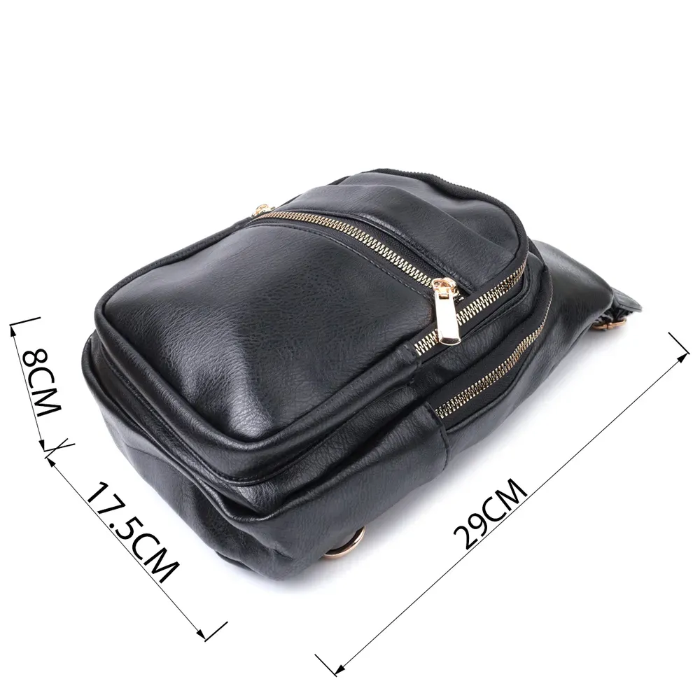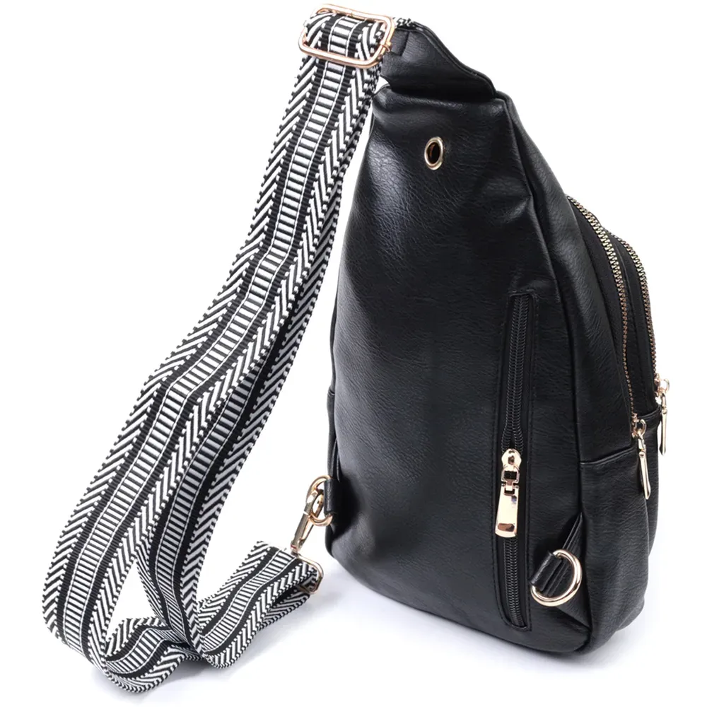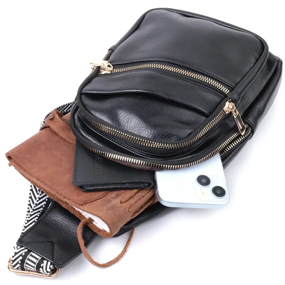 Пропонуємо до Вашої уваги зручну слінг сумку з екошкіри класичного чорного кольору. Дана модель складається з одного основного відділення, яке закривається на блискавку і в якому знаходиться кишеня на блискавці та кишеня відкритого типу всередині, а також чотирьох кишень зовні та одного отвору для кабелю або навушників, що дуже зручно в сучасному світі. Основною фішкою моделі є зручний регульований плечовий ремінець у етнічному стилі, що дуже модно вже кілька сезонів. Екошкіра – високоякісна альтернатива натуральному матеріалу, яка дуже стійка до тертя, до низьких температур, відмінно носиться на відміну від інших штучних матеріалів, а також має гіпоалергенний склад на відміну від натуральної шкіри.