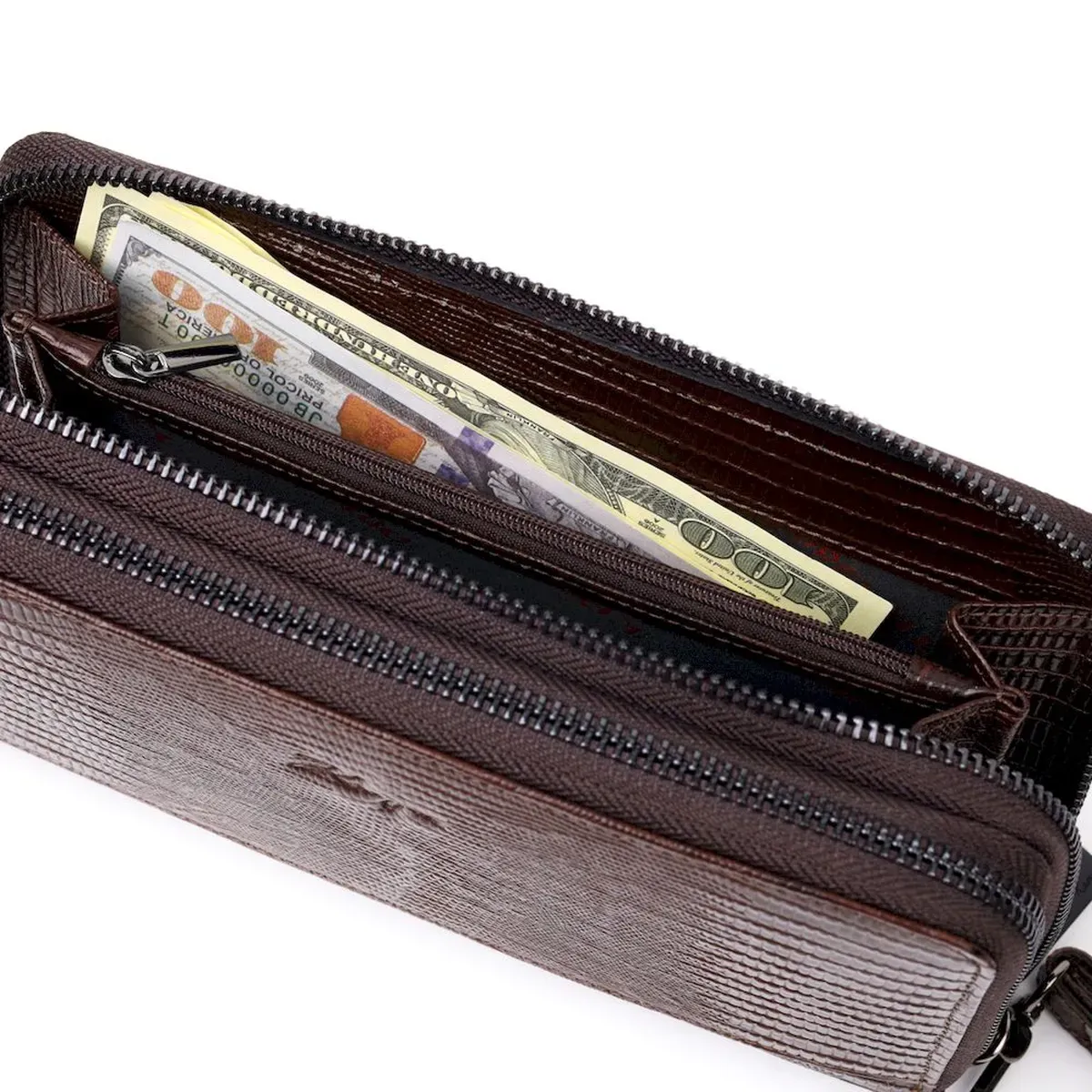 Стильный мужской клатч из натуральной фактурной кожи с использованием добротного текстиля (внутренняя подкладка). Носится с помощью ремешка на запястье или просто в руке. Используется качественная фурнитура цвета темного серебра. Барсетка в одно и тоже время, компактна и функциональна. С таким аксессуаром, мужчина будет выглядеть солидно и уверенным в себе.