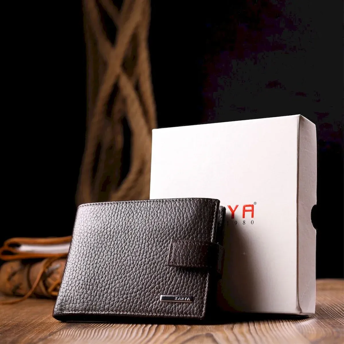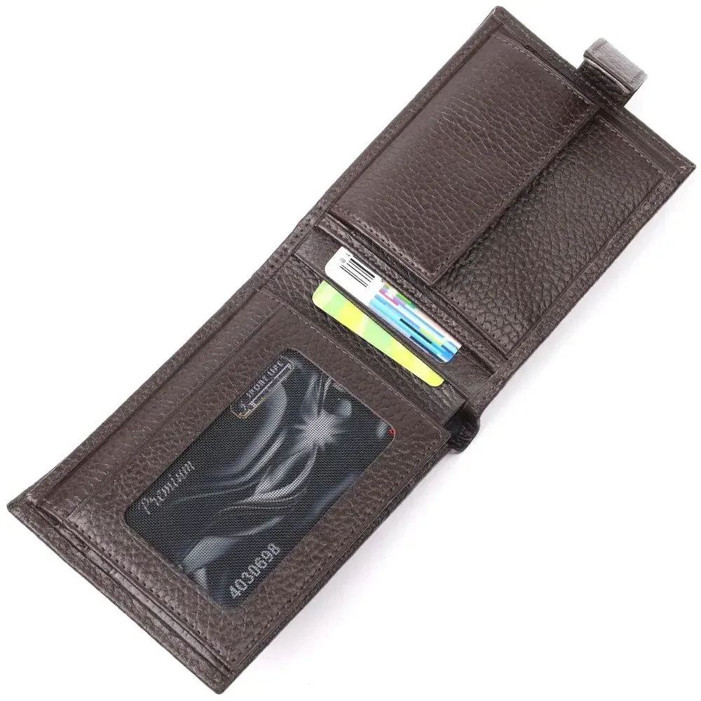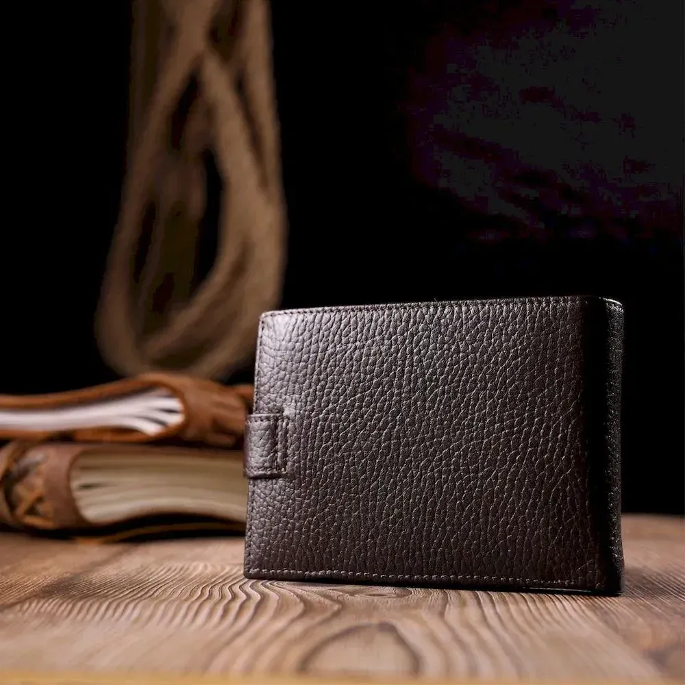 Компактный мужской кошелек из натуральной кожи в коричневом цвете. Изделие закрывается на хлястик с кнопкой . На лицевой стороне в виде декора расположен металлический логотип производителя. Аксессуар упакован в фирменную коробочку. Изделия из натуральной кожи всегда будут отличным подарком для близкого человека.