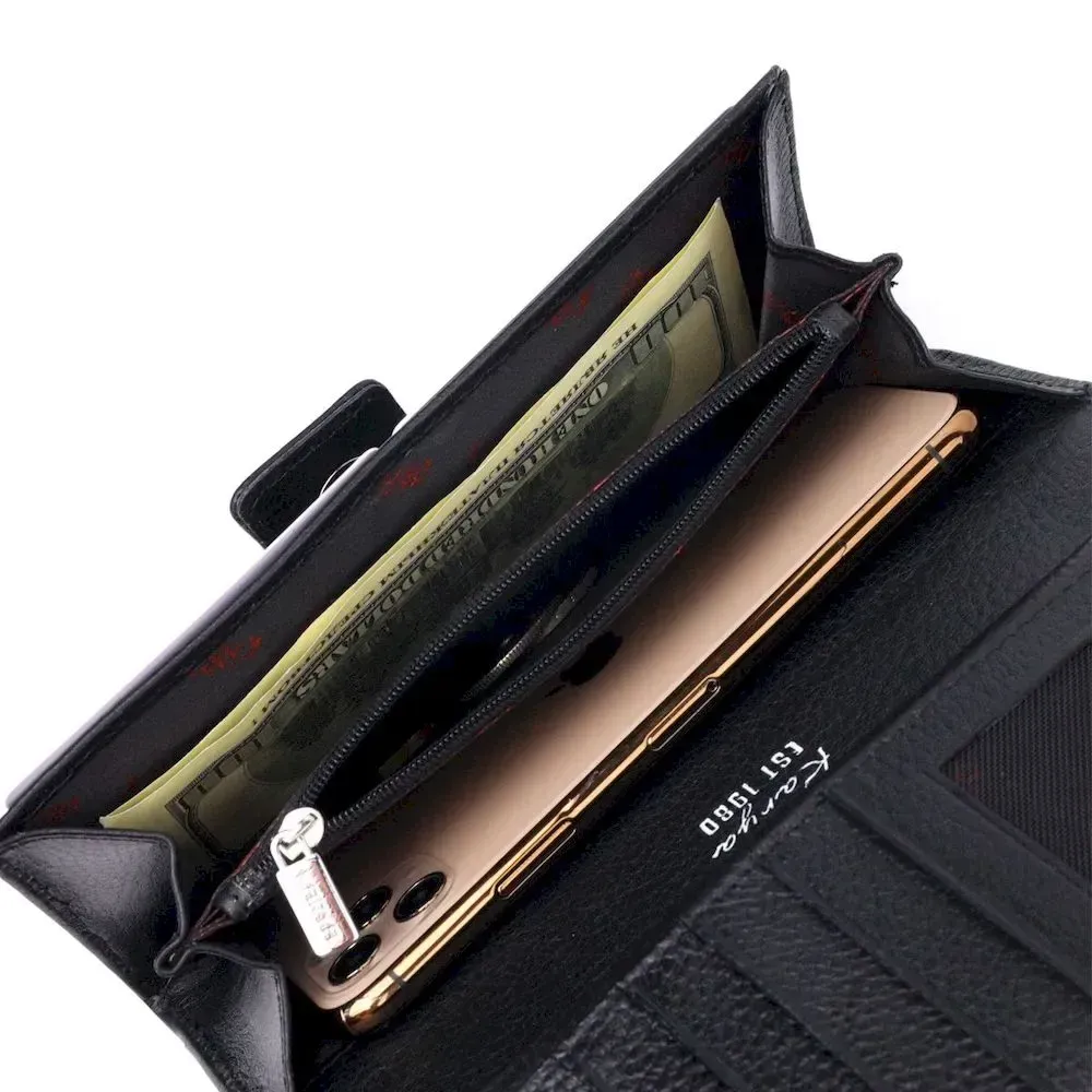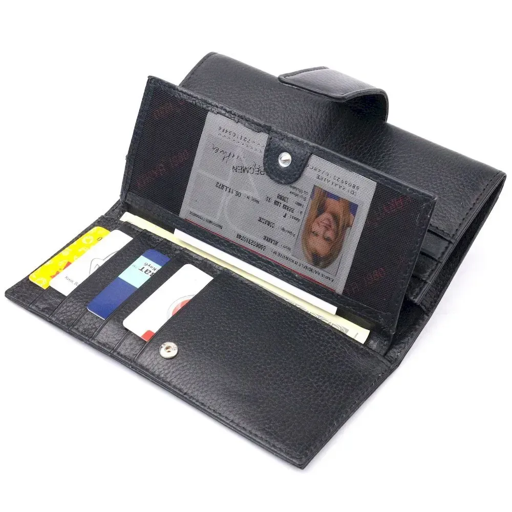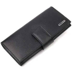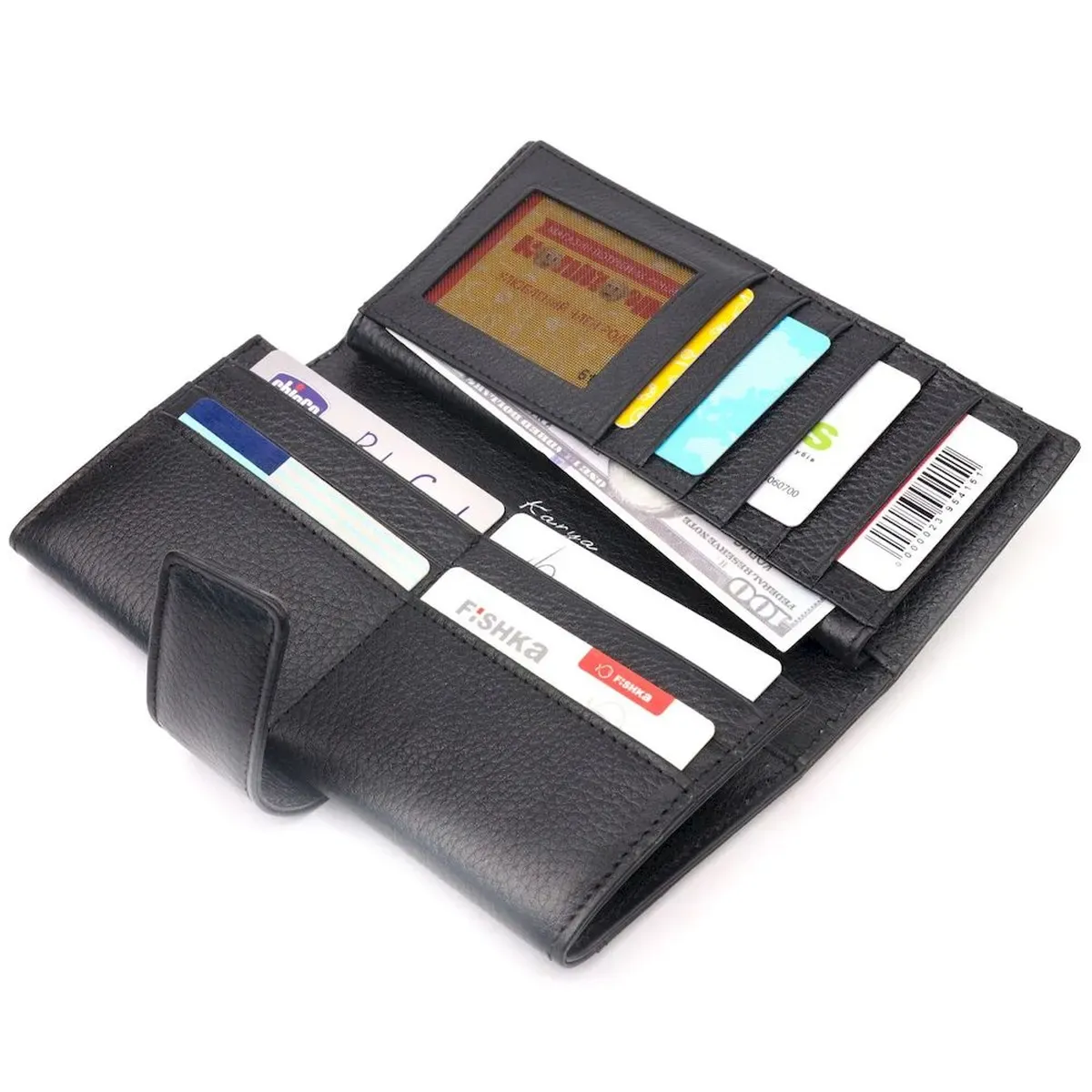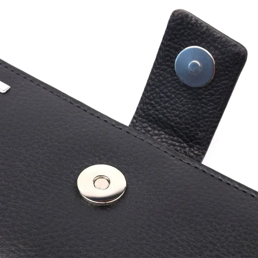 Стильный женский кошелек из натуральной кожи, в классическом черном цвете. Складывается аксессуар пополам, с фиксацией на хлястик и магнит. Особенностью данного аксессуара есть наличие блока для кредитных карточек, что закрывается на кнопку. Качественная фурнитура дополняет и украшает изделие. Такой кошелек из натуральной кожи - это идеальный вариант на каждый день для тех, кто ценит качество, удобство и комфорт, а также будет отлично дополнять Ваш повседневный образ.