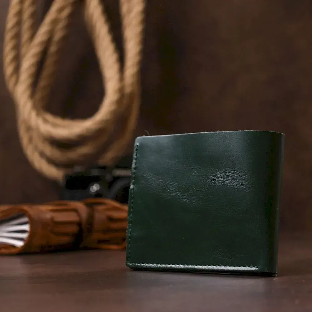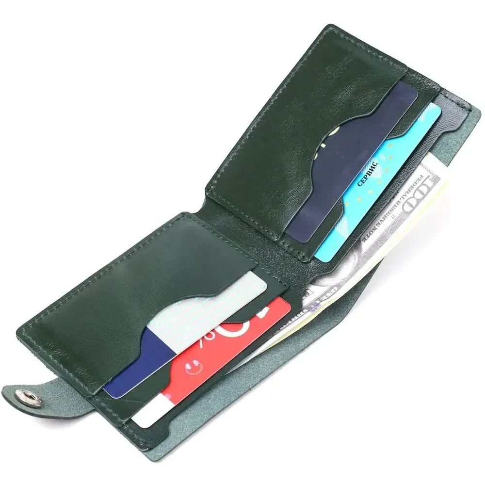 Замечательное портмоне унисекс для ценителей негромоздких, но вместительных аксессуаров. Выполнено оно из натуральной кожи высокого класса и улучшенными показателями устойчивости к износу. Внутри поместятся купюры, а также банковские и визитные карточки. Цвет изделия – зеленый, который смотрится очень элегантно и красиво.