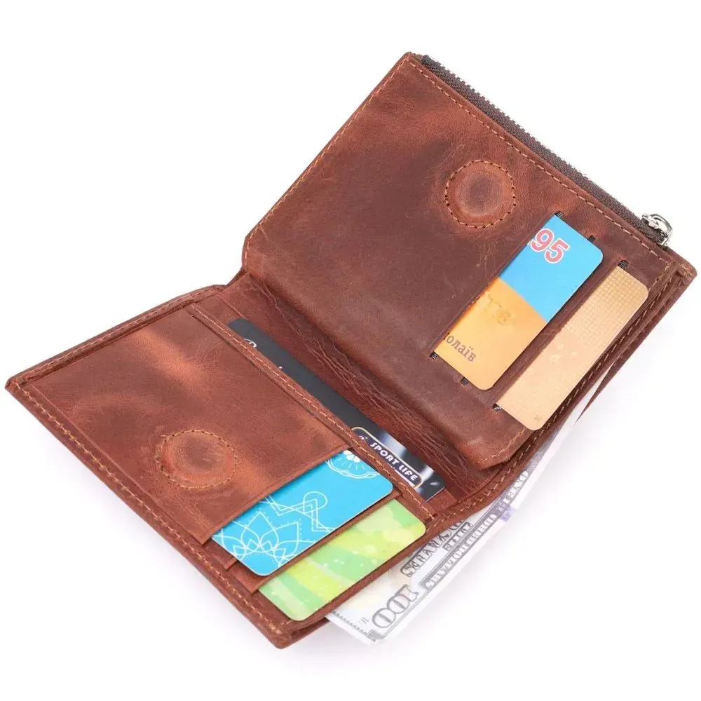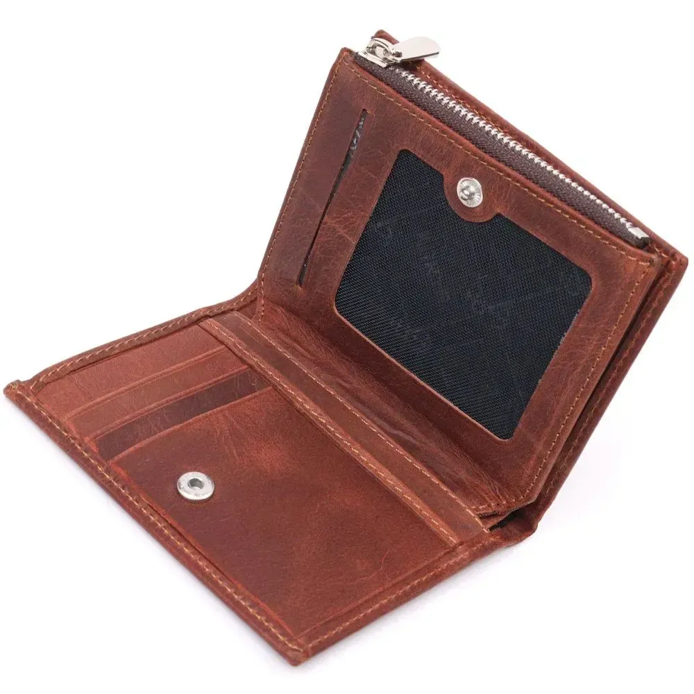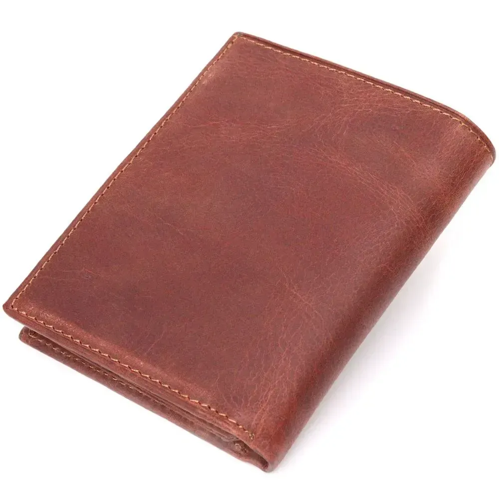 Удобный компактный кошелек из натуральной винтажной кожи высокого качества, изделие коричневого цвета. Внутри есть отделение для купюр, десять ячеек для кредитных карт, монетница на молнии и четыре скрытых кармана. В изделии использована качественная фурнитура, а также прочная фирменная подкладка. Не большой кожаный кошелек поместится даже в самую маленькую сумочку. Закрывается модель в два сложения на кнопку.