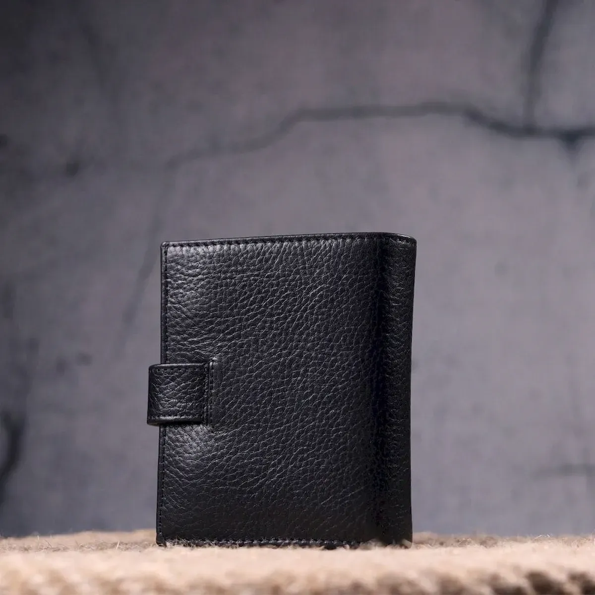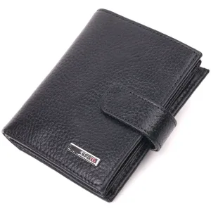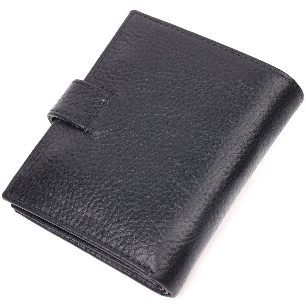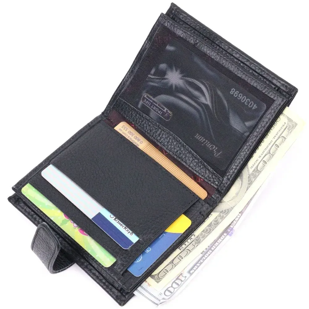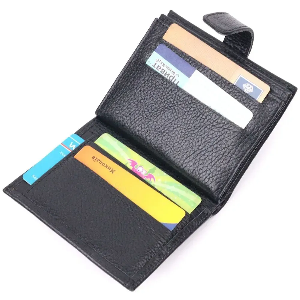Практичное компактное портмоне из натуральной кожи, что закрывается хлястиком на кнопку. Изделие имеет большой карман для купюр. Внутри достаточно ячеек для кредиток. Изделие продумано для современного человека. Изделие имеет насыщенный черный цвет. Оригинальный аксессуар выгодно выделит вас из толпы. Кошелек станет прекрасным подарком для Ваших близких.