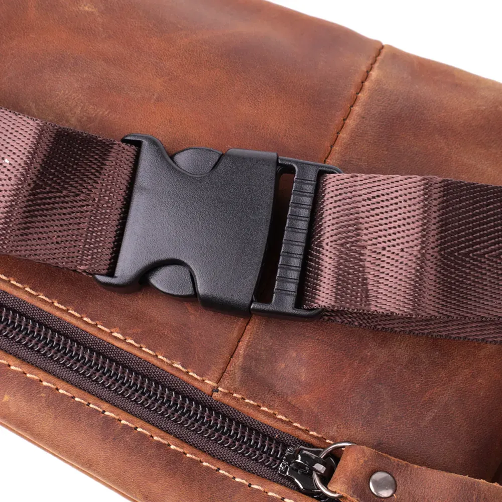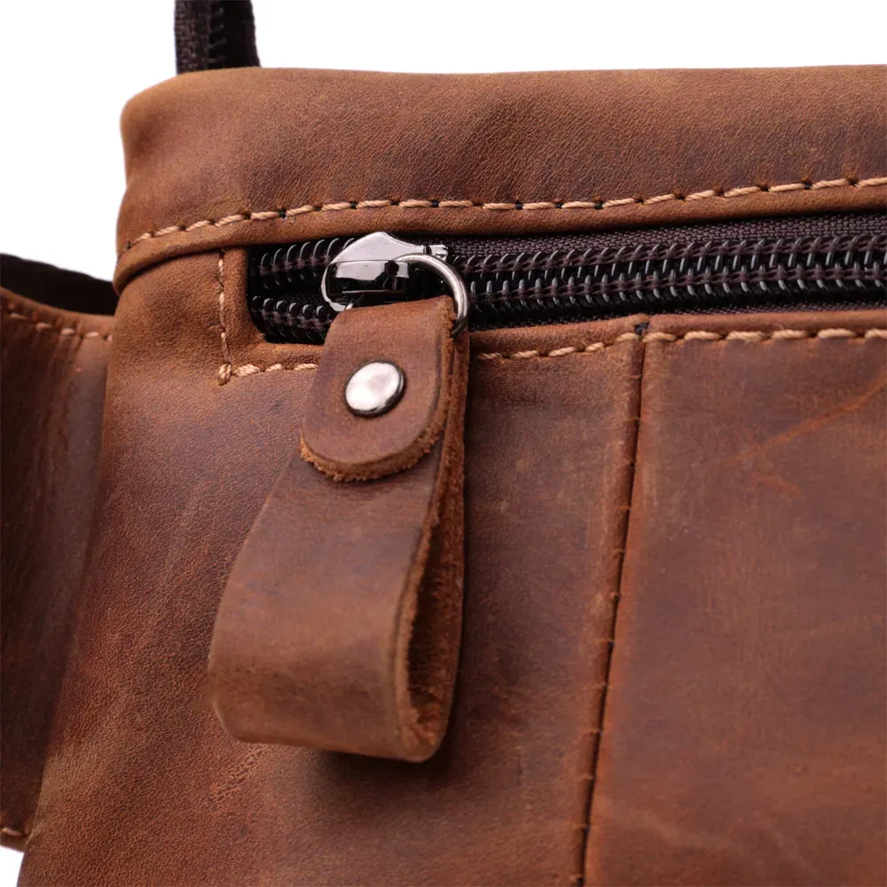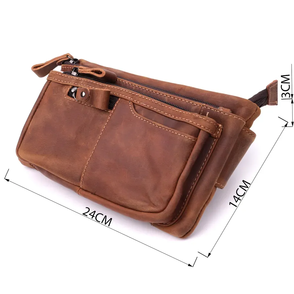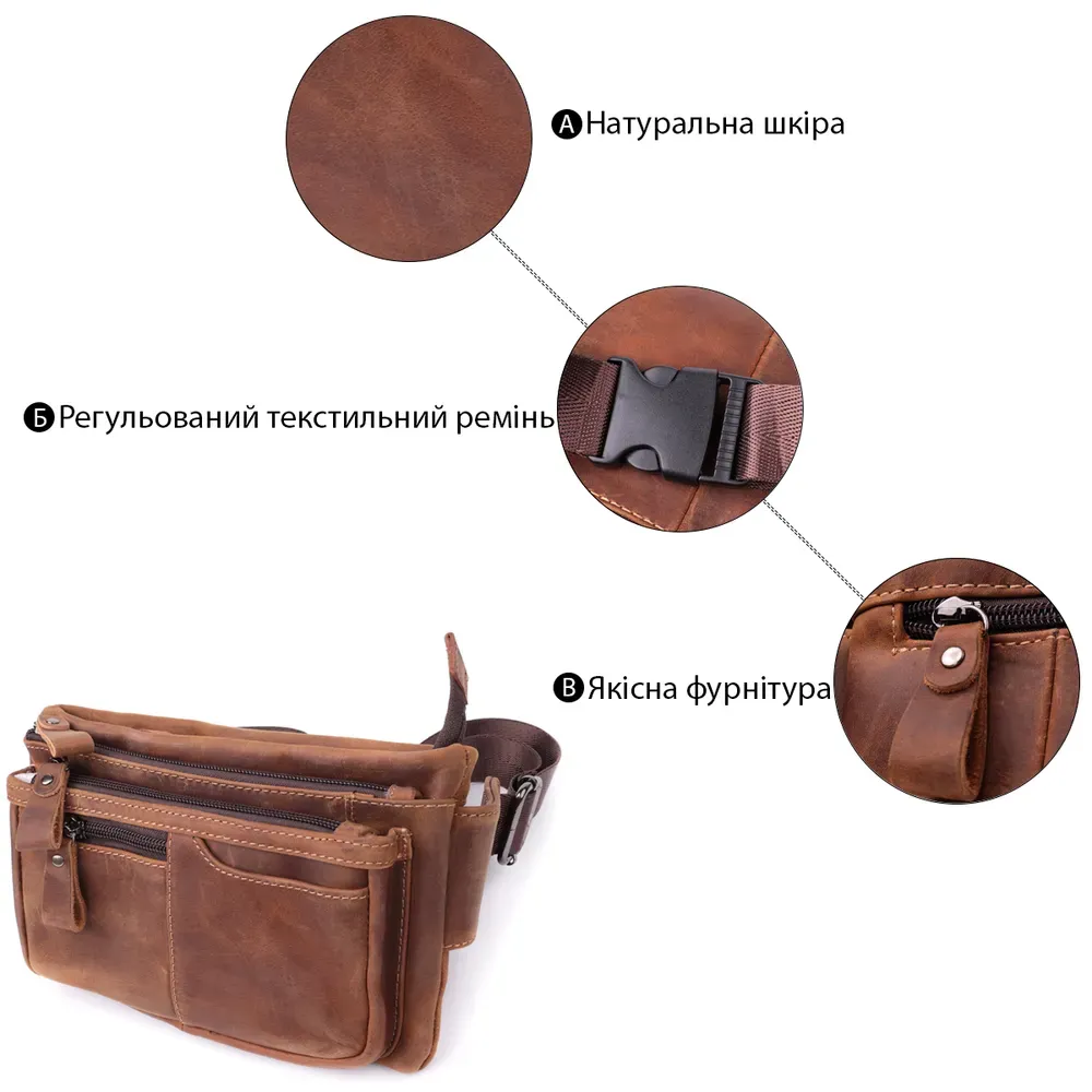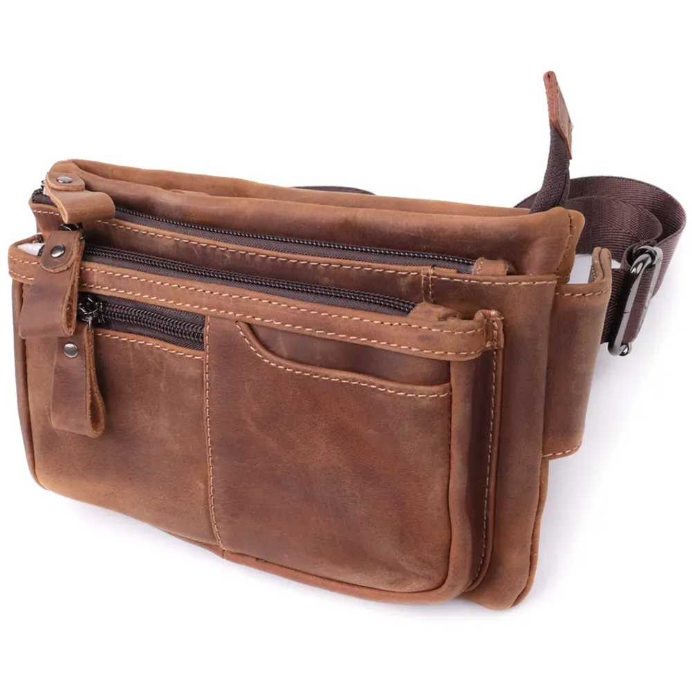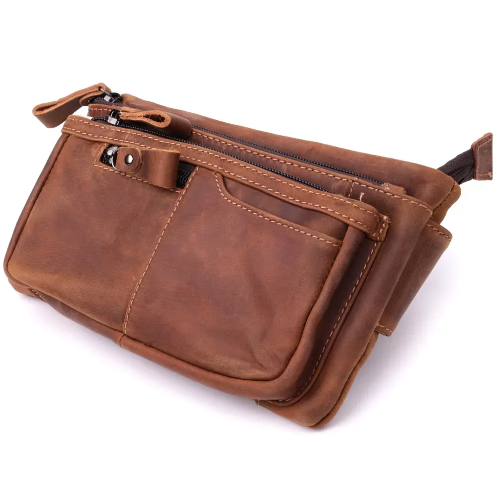 Відмінна сумка на пояс із натуральної вінтажної шкіри - якісної та довговічної. Поясні сумки користуються величезною популярністю серед чоловіків, тому що з такою сумкою все найважливіше буде завжди під рукою. Відмінний варіант на кожен день - малогабаритний, але досить місткий. Вам буде легко з такої сумки дістати документи чи гроші за потреби. Модель прошита коричневою строчкою і доповнена фурнітурою сріблястого кольору. Такий аксесуар буде добре виглядати як подарунок для близької людини.