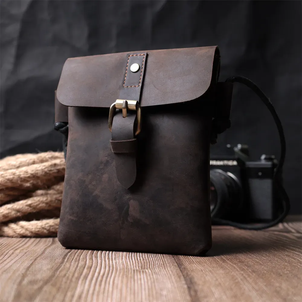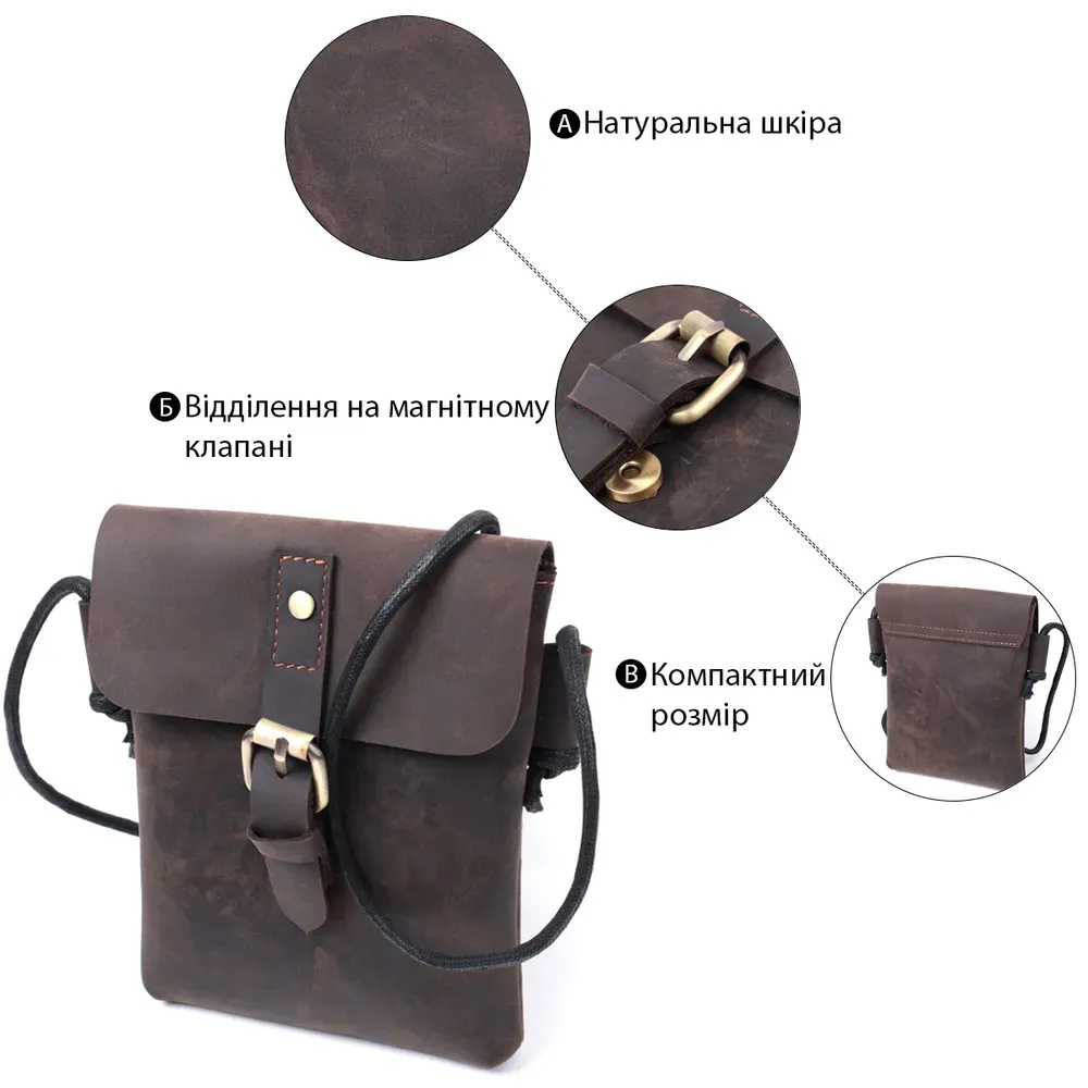 Модна сумка із натуральної вінтажної шкіри високої якості. Має приємну на дотик фактуру та гарний коричневий колір. Відмінно підійде як жінкам, так і чоловікам будь-якого віку. Ремінь виготовлений з міцного текстилю і може регулюватися по довжині.
