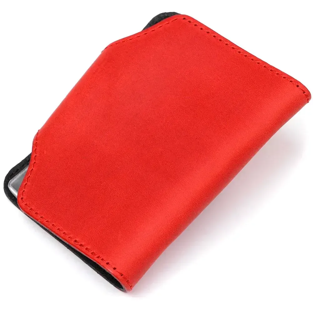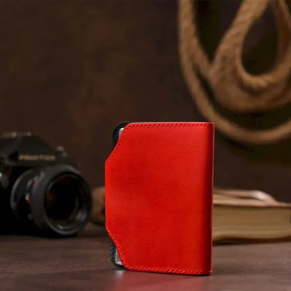 Яркая визитница из натуральной винтажной кожи особенностью, которой есть потертости и неоднородность окраса. Со временем кожа затирается и шлифуется, так что некоторые следы исчезнут сами собой. Аксессуар прошит прочной светло-красной нитью, что отлично вписывается в дизайн и продлевает срок службы изделия.
