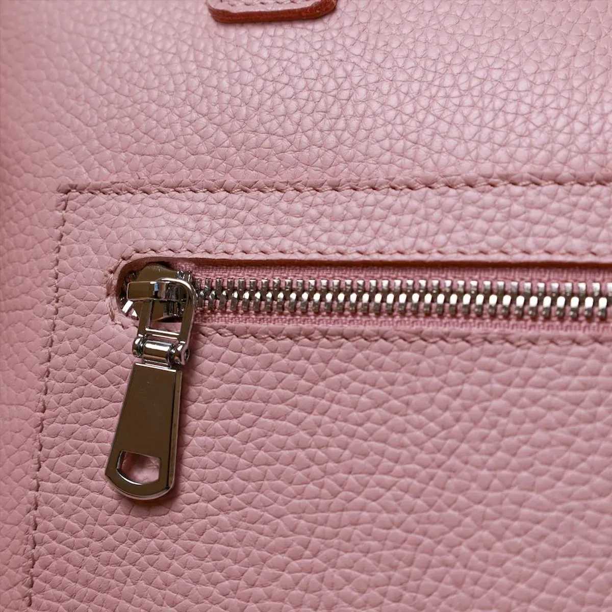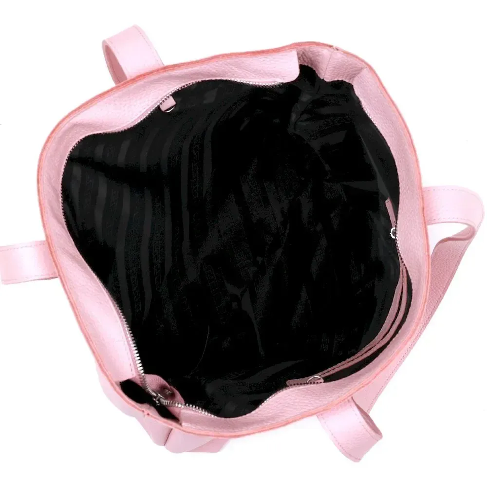 Отличная женская сумка-шоппер стандартного размера в современном дизайне. Материал изготовления – натуральная кожа высокого класса с высокими показателями прочности и стойкости к износу. Цвет данной модели – бледно-розовый, что смотрится очень нежно и красиво, фактура – зернистая. Основное отделение закрывается на молнию, на внешней стороне присутствует небольшой карманчик.