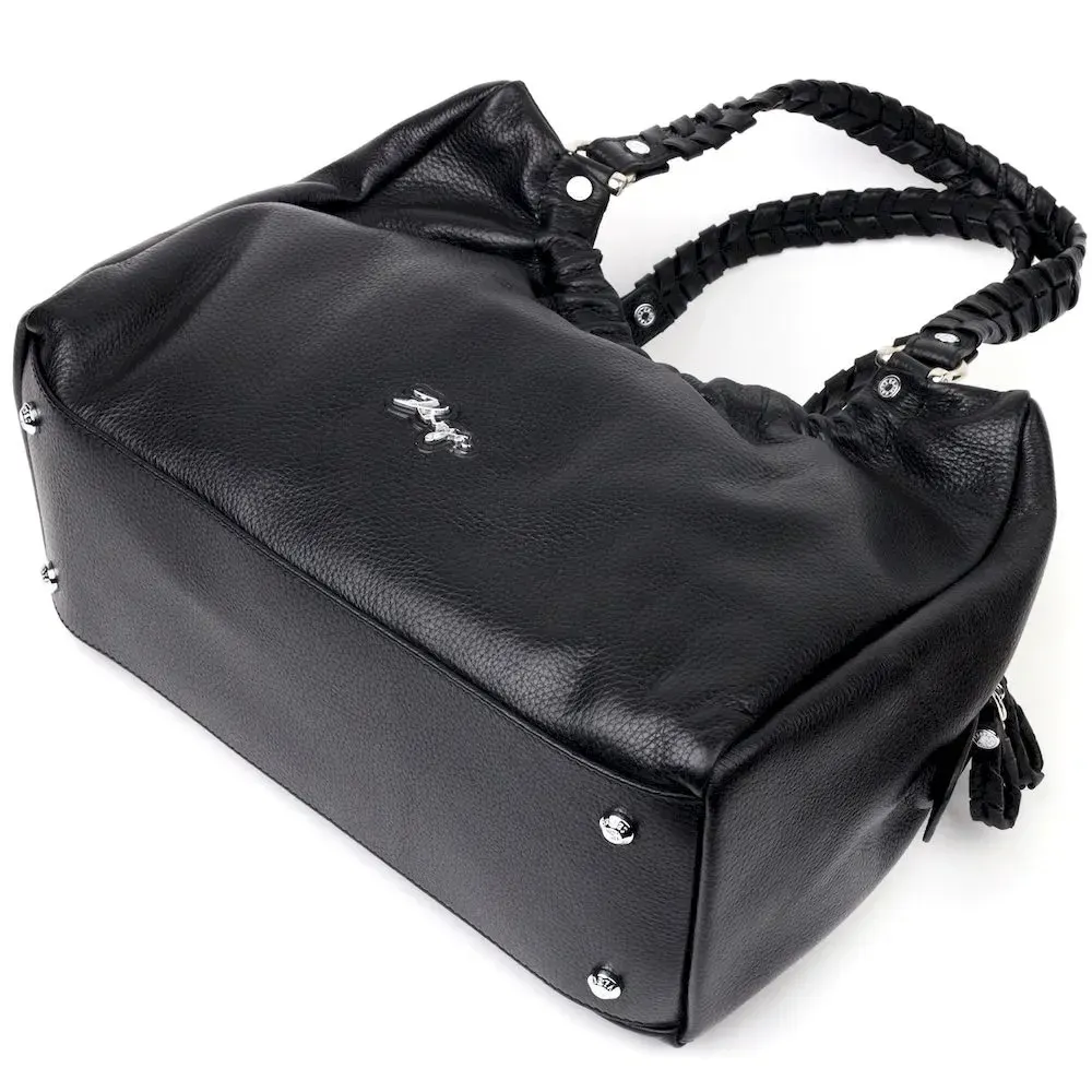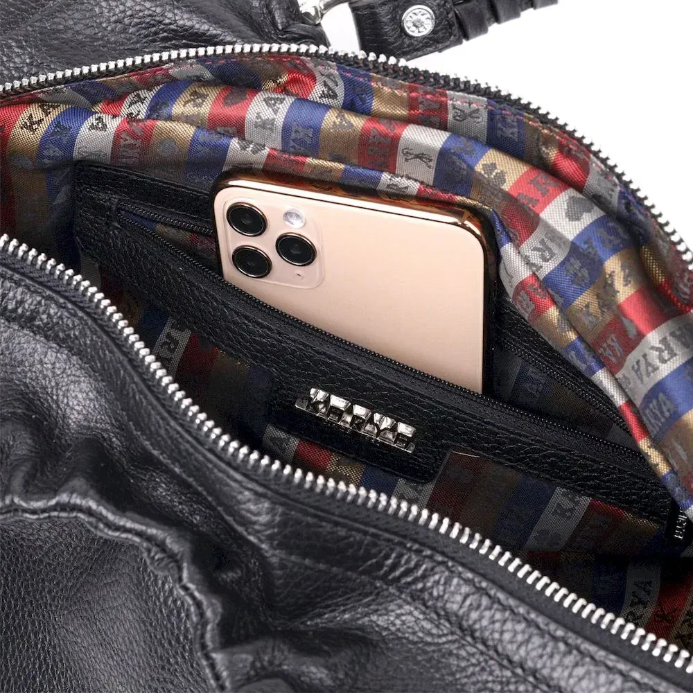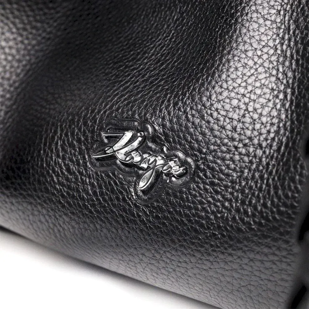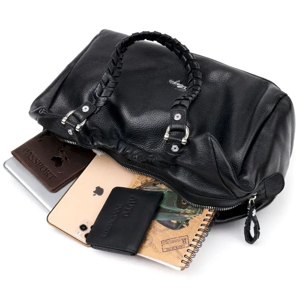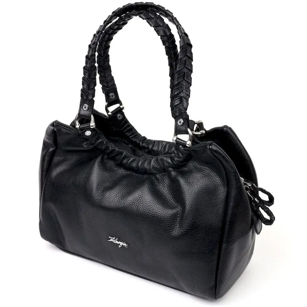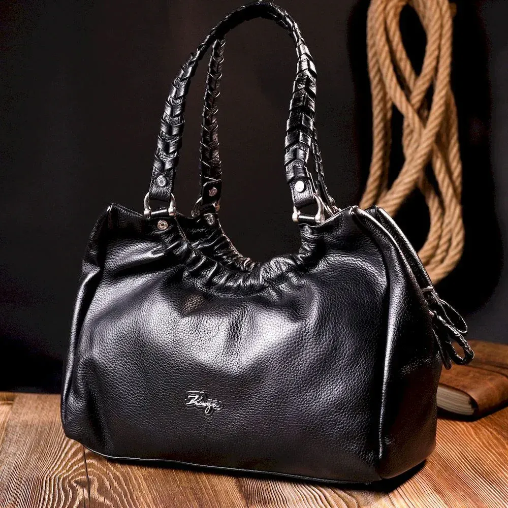 Вместительная женская сумка из натуральной зернистой кожи, классического черного цвета. Сумка функциональна и удобна в эксплуатации, качественная фурнитура серебристого цвета не только дополняет стильный дизайн сумки, но и защищает изделие. Аксессуар упакован в фирменный текстильный мешок Karya. Сумка из натуральной кожи всегда будет отличным подарком любой женщине.