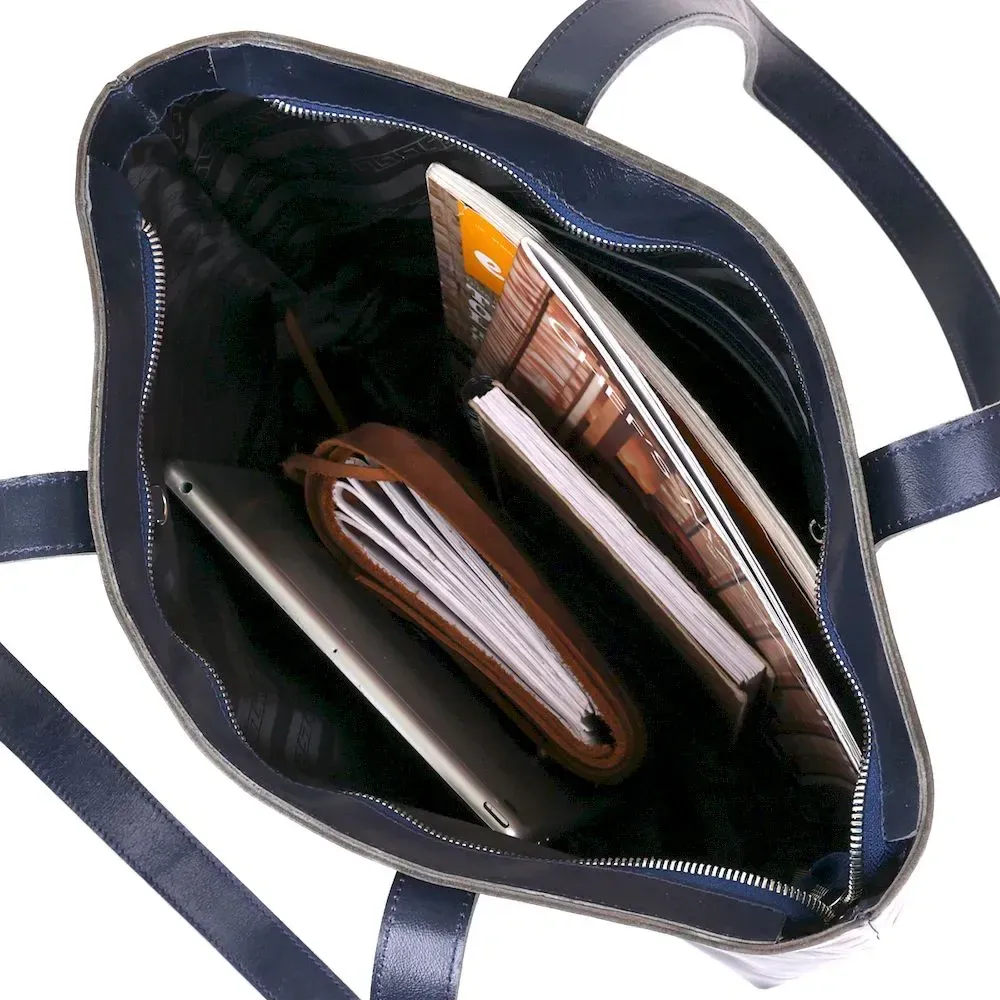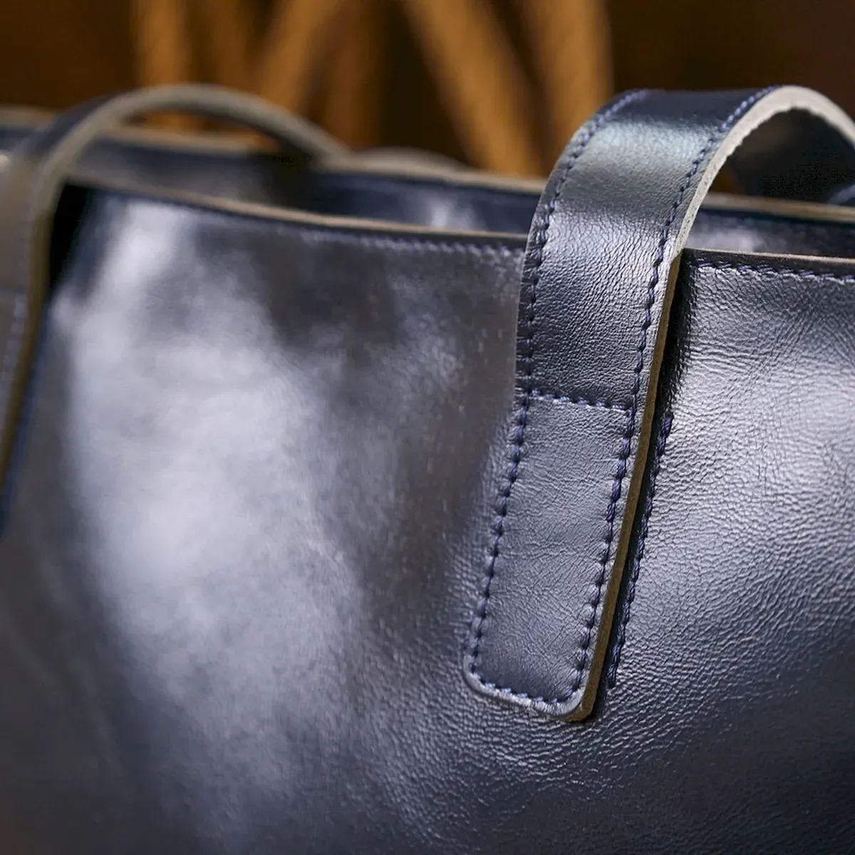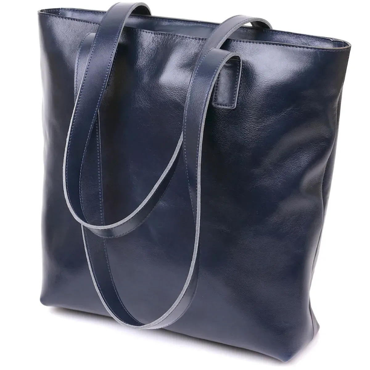 Вместительная сумка-шоппер в современном и модном дизайне от украинского производителя. Материал изготовления – натуральная кожа высокого качества с отменными эксплуатационными показателями. Закрывается сумка на молнию, внутри одно просторное отделение и потайной карман. Цвет – синий с отливом, что смотрится очень красиво и стильно, фактура – гладкая.