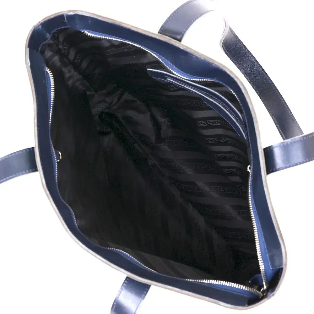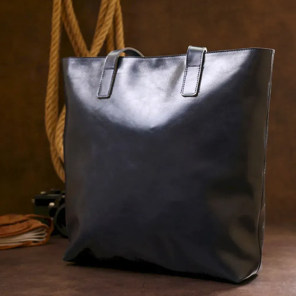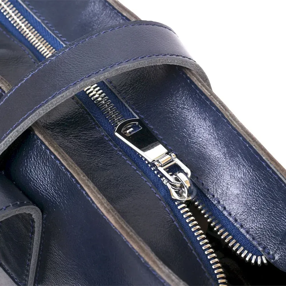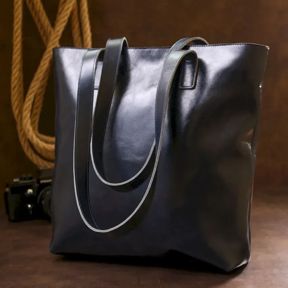 Вместительная сумка-шоппер в современном и модном дизайне от украинского производителя. Материал изготовления – натуральная кожа высокого качества с отменными эксплуатационными показателями. Закрывается сумка на молнию, внутри одно просторное отделение и потайной карман. Цвет – синий с отливом, что смотрится очень красиво и стильно, фактура – гладкая.