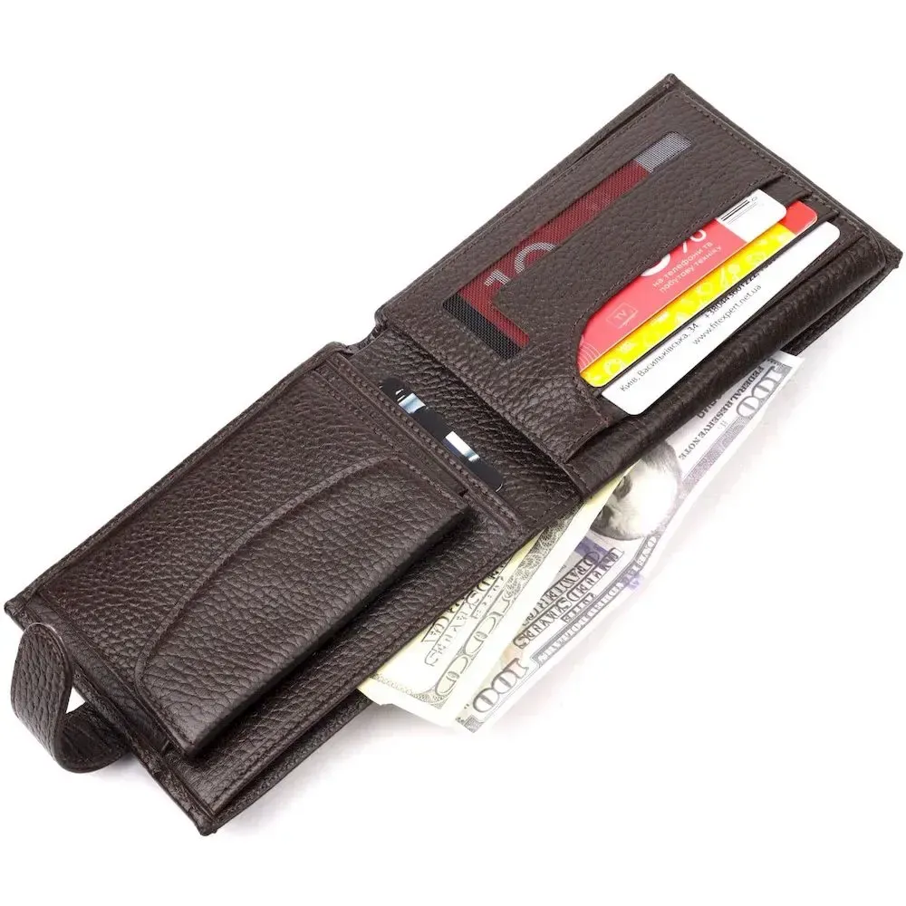 Вместительный мужской кошелек из натуральной кожи, в коричневом цвете. Изделие закрывается хлястиком на кнопку. Изделие имеет вместительные отделения для купюр и внутри достаточно ячеек для кредиток. Изделие упаковано в фирменную коробочку. Изделия из натуральной кожи всегда будут отличным подарком для близкого человека.