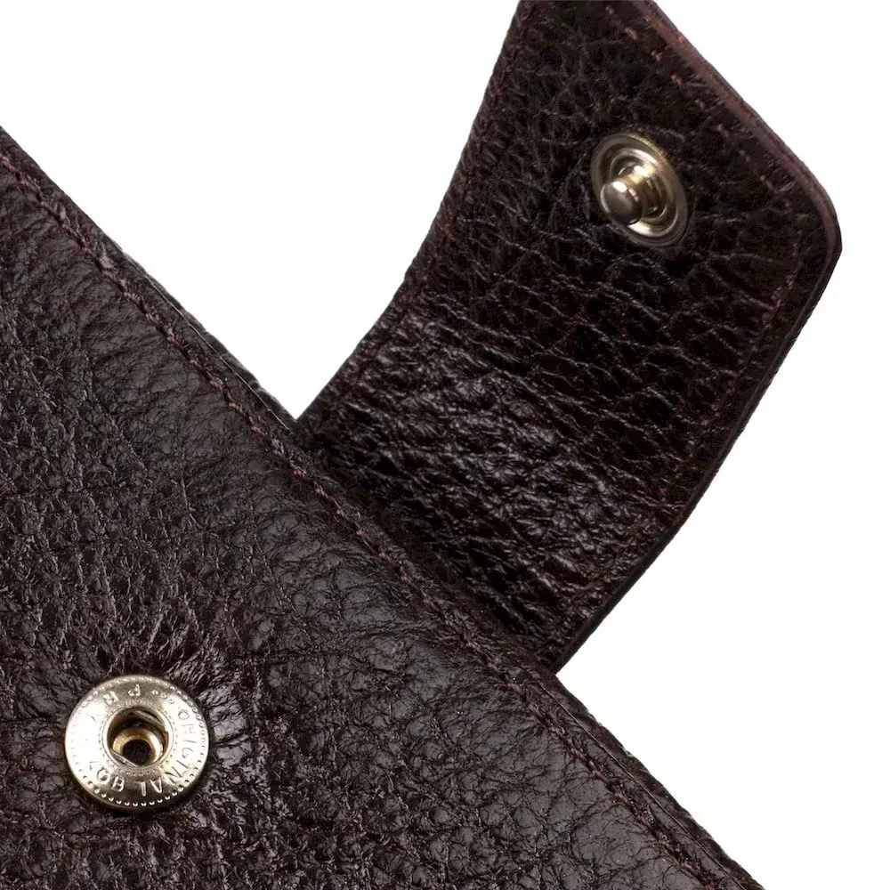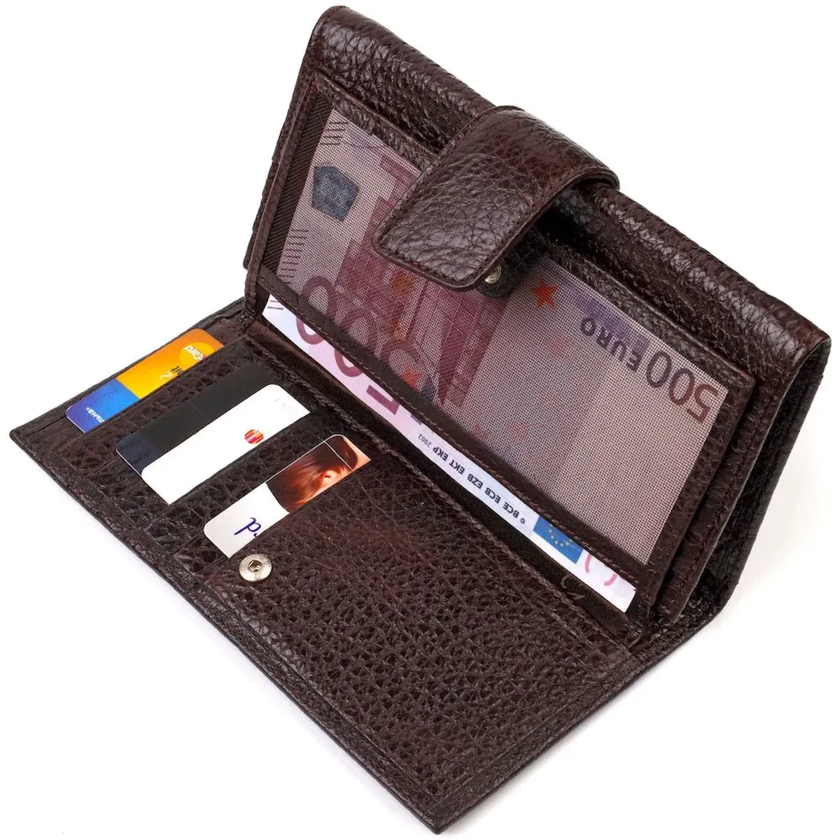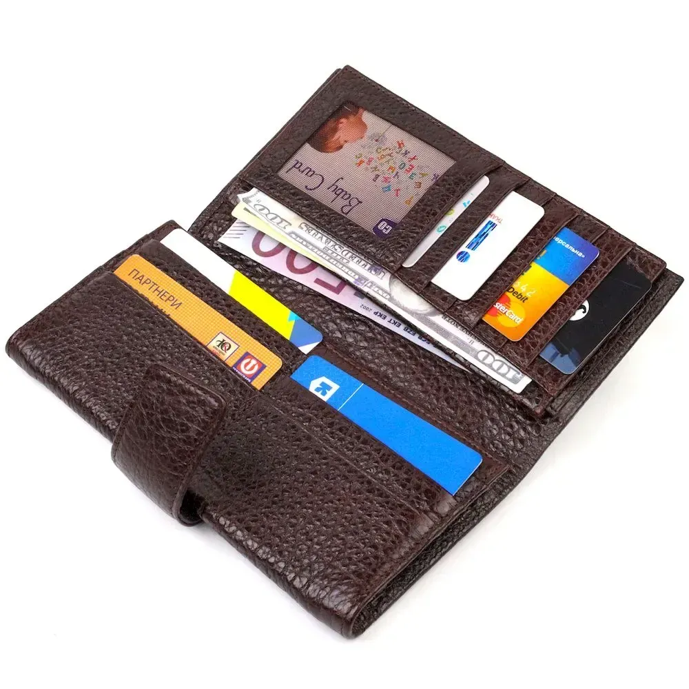 Достойный мужской кошелек из натуральной крупнозернистой кожи. Аксессуар имеет одно основное отделение с тканевой перегородкой на молнии, восемнадцать карманов для карточек, карман под сеточкой для пропуска, два скрытых кармана и монетницу. Закрывается аксессуар в два сложения хлястиком на кнопку. На лицевой стороне, в правом нижнем углу металлический логотип компании производителя. Приобретая кожаный аксессуар этой фирмы, себе или на подарок, будьте уверены, что он прослужит Вам не один год.