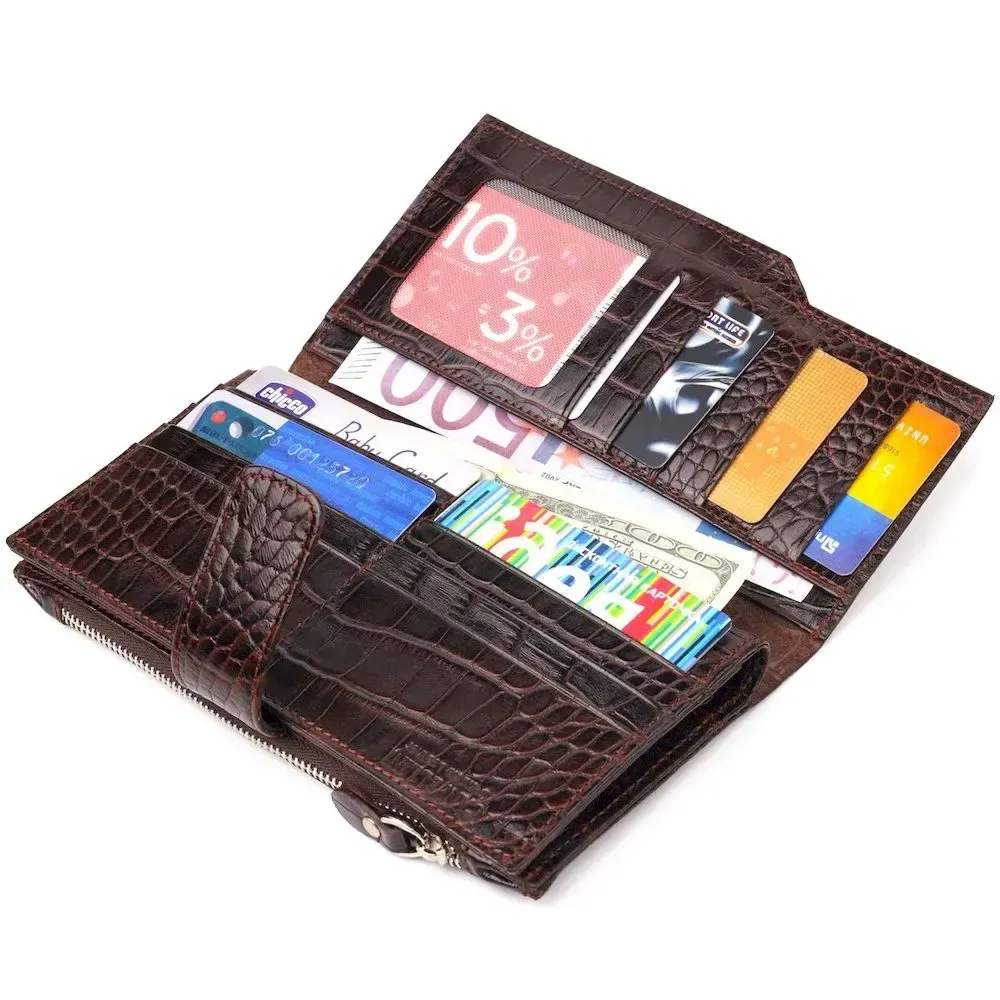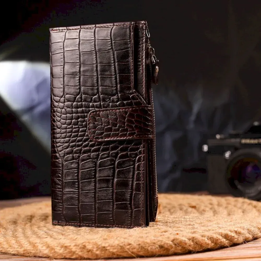 Вместительный женский кошелек, из натуральной фактурной кожи, с тиснением под крокодила. Аксессуар имеет шесть прилегающих карманов, в которые поместятся купюры всех номиналов, вместительную монетницу и двадцать карманов для карточек. Закрывается аксессуар хлястиком на кнопку. Если Вы хотите порадовать и себя и удивить близких, то непеременно покупайте кожаные аксессуары в нашем магазине, качество и цена Вас однозначно порадует.