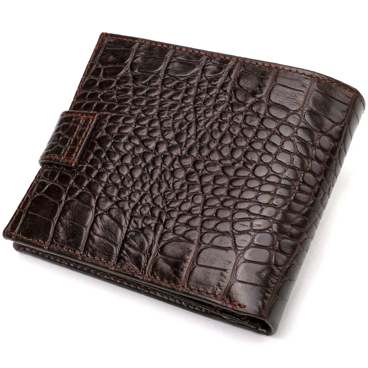 Отличный мужской кошелек среднего размера из натуральной кожи с тиснением под крокодила. Аксессуар имеет основное отделение для купюр с перегородкой, четыре ячейки для карточек, два кармана под сеточкой, три прилегающих кармана и монетницу. Кошелек складывается пополам, закрывается хлястиком на кнопку. На лицевой стороне в правом нижнем углу, расположен металлический логотип компании производителя. Покупая кожаный кошелек в нашем магазине, Вы получаете модный, стильный аксессуар, который прослужит не один год.