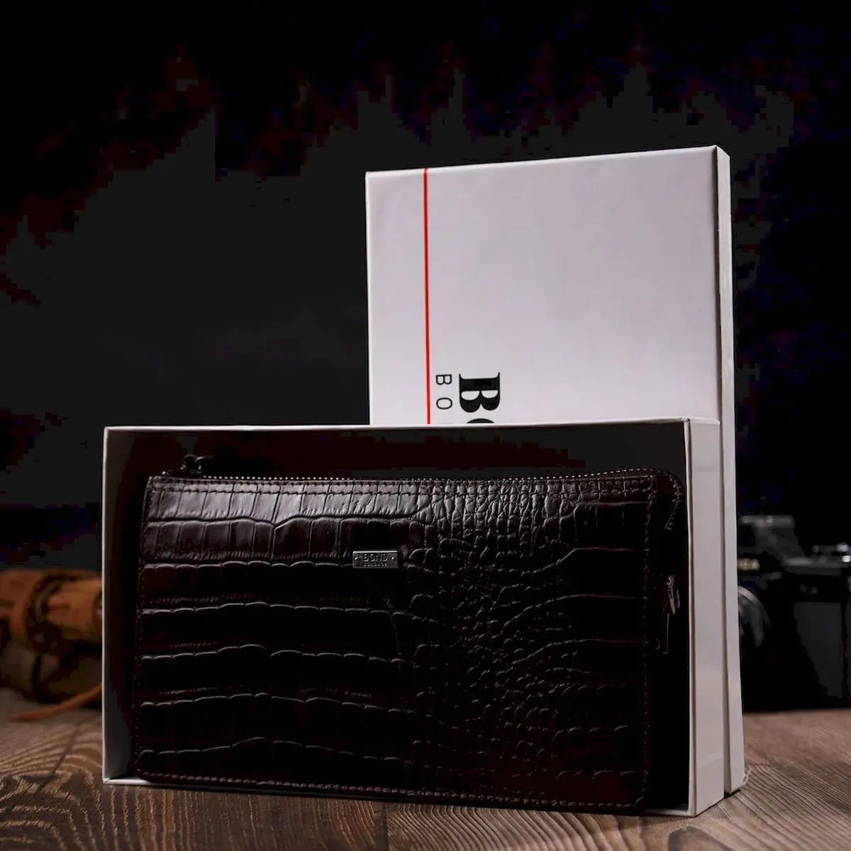 Вместительный мужской клатч на два отделения из натуральной кожи с тиснением под крокодила BOND 22046 Коричневый