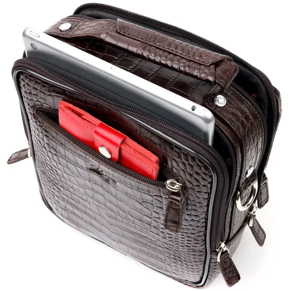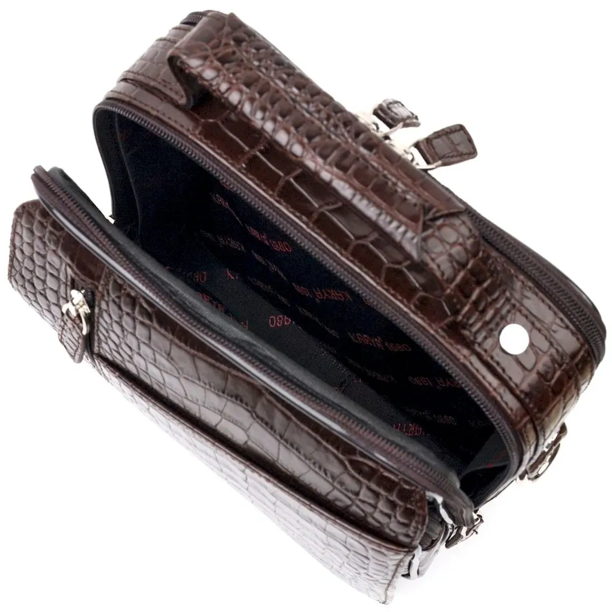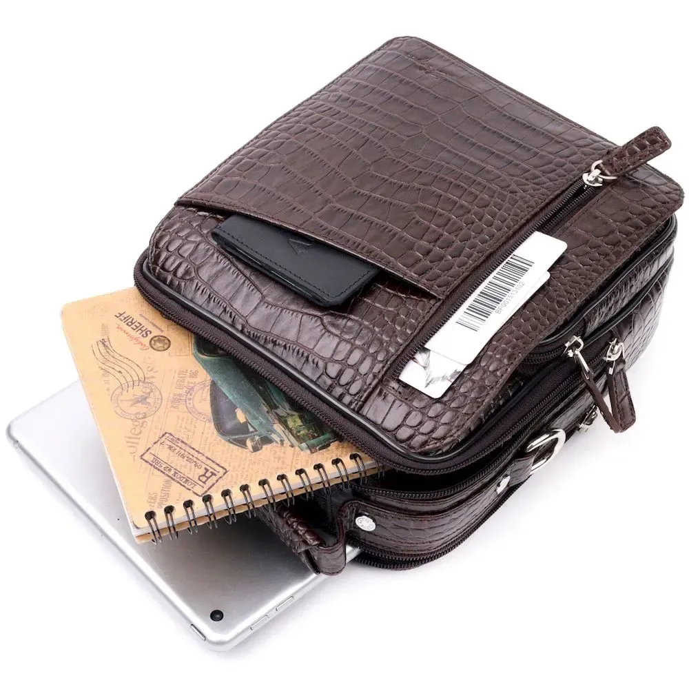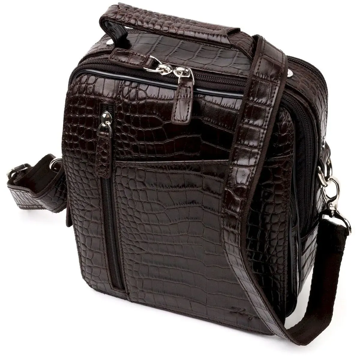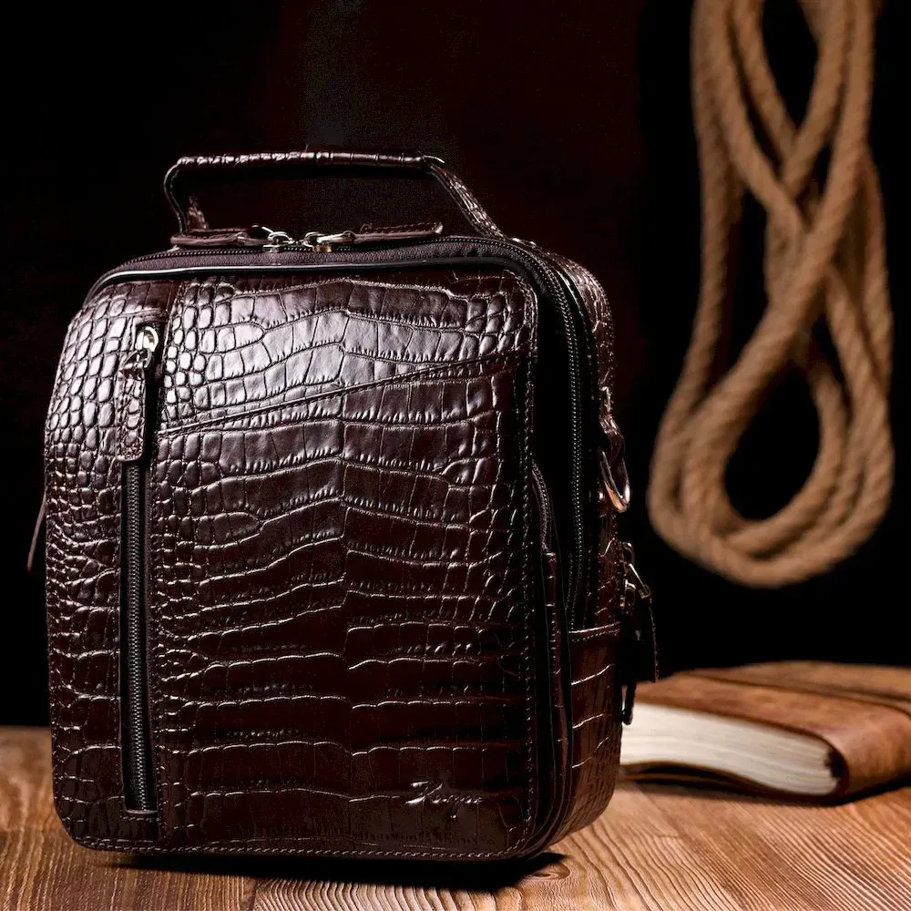 Мужская сумка через плечо Karya выполнена из натуральной кожи, с тиснением под крокодила. Удобная и многофункциональная модель. Отличный вариант на каждый день. Качественная кожа устойчива к износам и долго носится и выглядит она очень эффектно. Модель дополнена фурнитурой цвета серебра. Внутри сумки качественная подкладка. Будет идеальным вариантом для подарка близкому человеку.