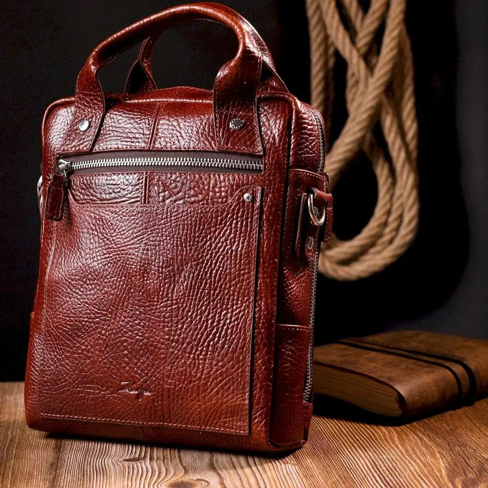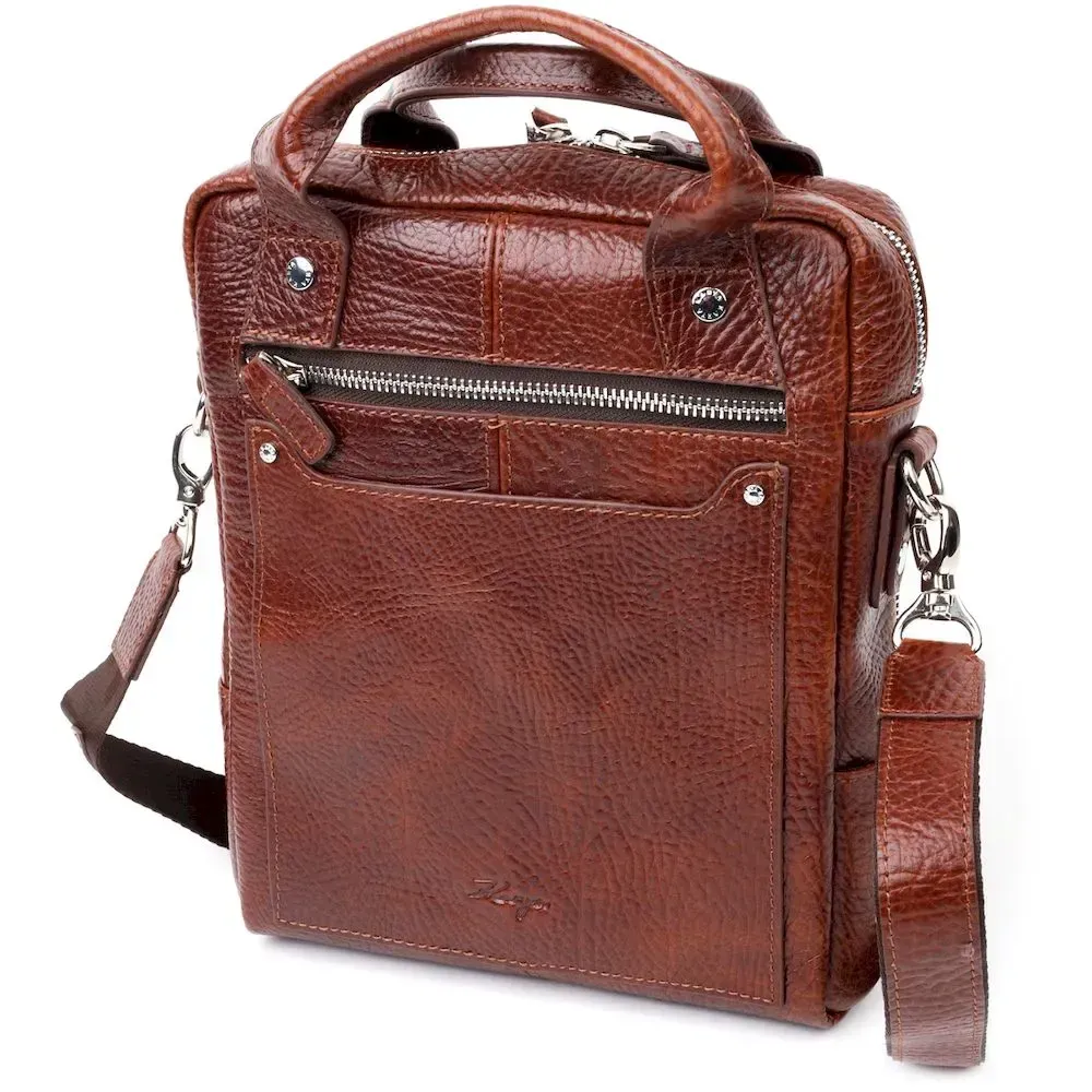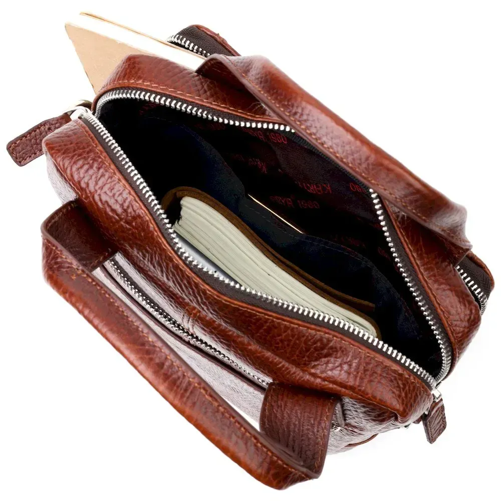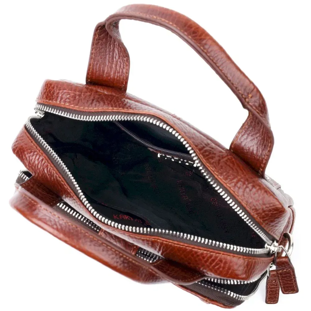 Мужская сумка коричневого цвета из натуральной зернистой кожи высокого качества. Аксессуар имеет надежную фурнитуру серебристого цвета и прочную подкладку. Изделие упаковано в фирменный текстильный мешок Karya. Качественная мужская сумка из натуральной кожи, всегда была отличным подарком для мужчины любого возраста.