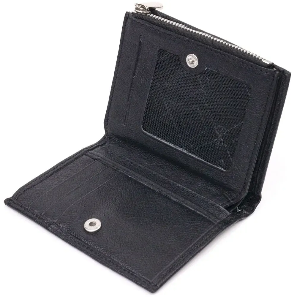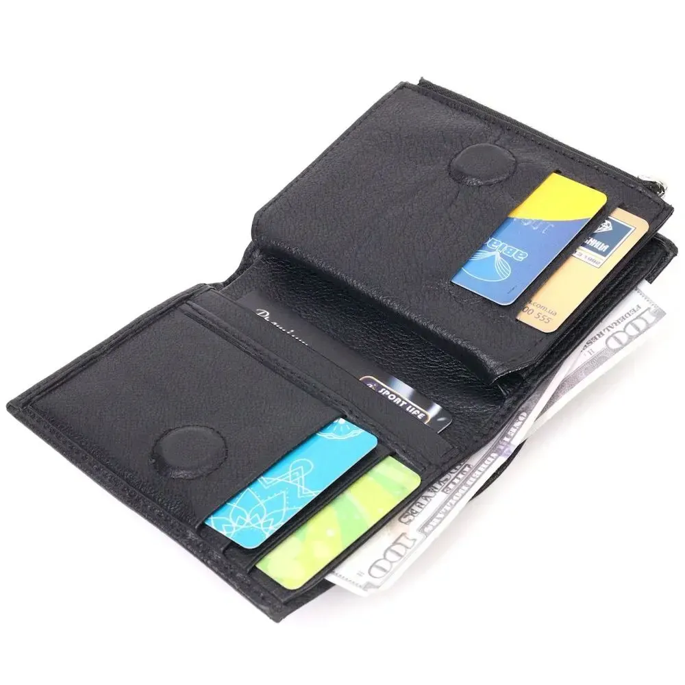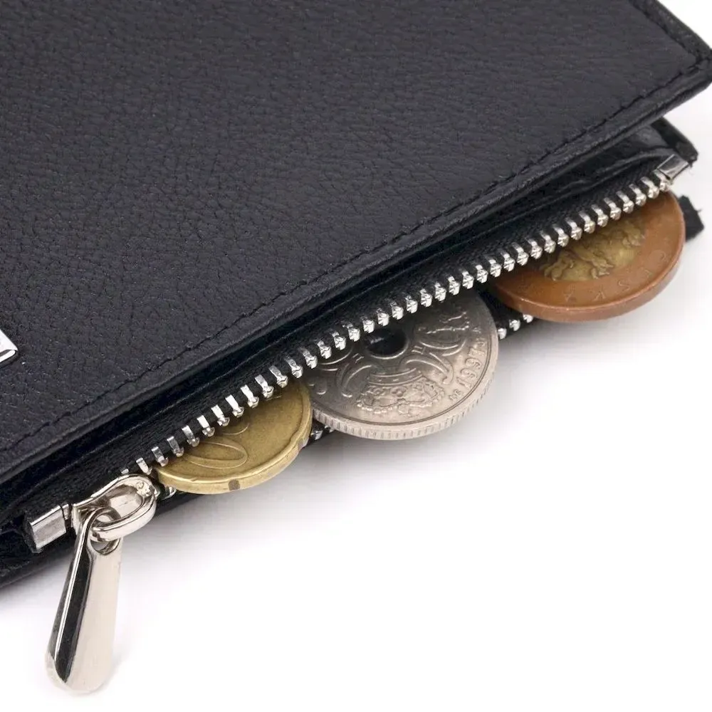 Превосходный компактный кошелек из натуральной кожи высокого качества, изделие классического черного цвета. Внутри есть отделение для купюр, десять ячеек для кредитных карт, монетница на молнии и четыре скрытых кармана. В изделии использована качественная фурнитура, а также прочная фирменная подкладка. Закрывается модель в два сложения на кнопку.